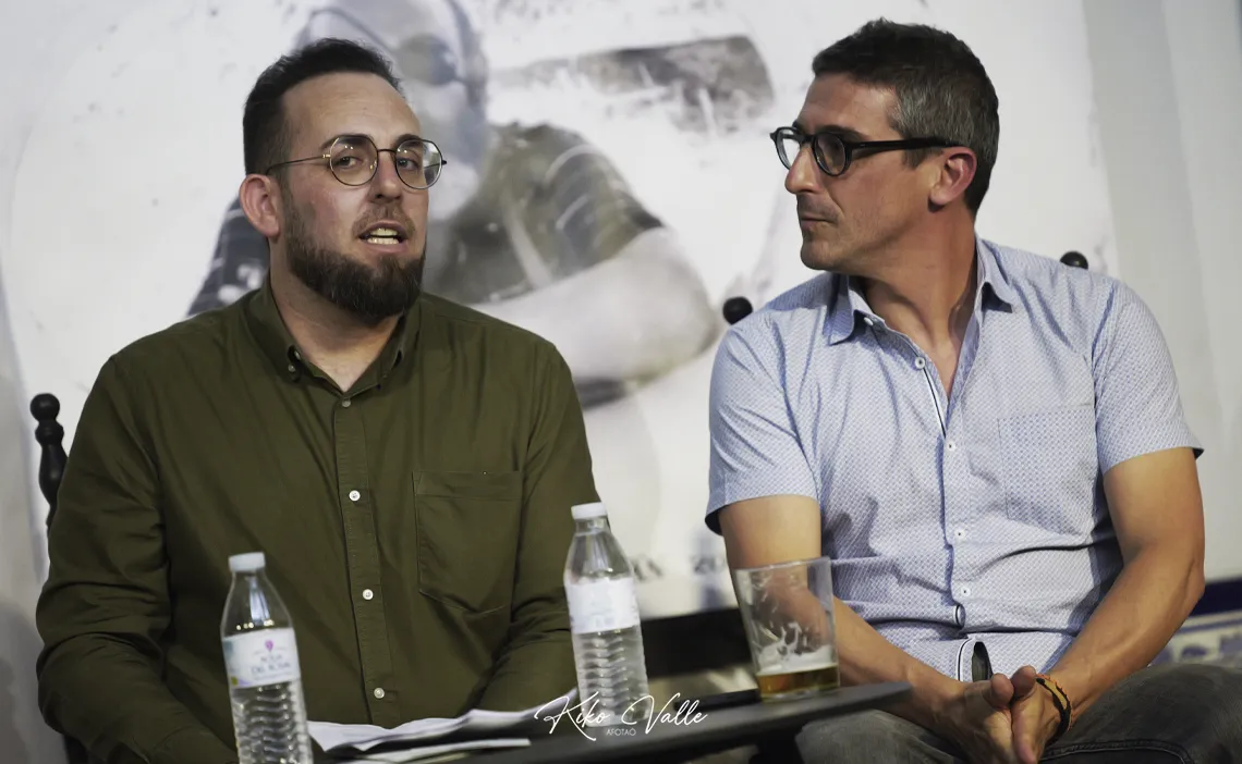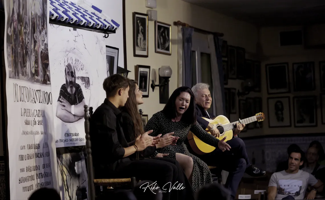 Miguel Ángel Martín, delegado de Desarrollo, Servicios Públicos, Transición Ecológica y Comunicación del Ayuntamiento de La Puebla, desgranó someramente el elenco y los actos previos de La Reunión. Por su parte, Miguel Ángel Rivero, ex delegado de Cultura del municipio, disertó con elocuencia sobre la idiosincrasia del encuentro y la obra de Francisco Moreno Galván que encabeza el cartel. Lleva por título La fuente de lo jondo y en ella se ven reflejados los agentes necesarios e indispensables que Francisco entendía que requería el flamenco: la rabia, porque «el cante de verdad hiere», simbolizado en una jauría de perros y en el torso de un cantaor que transparenta la sangre y el dolor de las costillas en carne viva; los flamencos y el público, siempre presente y partícipe del ritual sin el cual todo lo demás no tiene sentido. De ahí que se llame reunión y no festival, en coherencia con el pensamiento de quien se cumple un siglo desde que viera la luz, efeméride que se conmemora a conciencia este año con numerosos actos en su honor.
