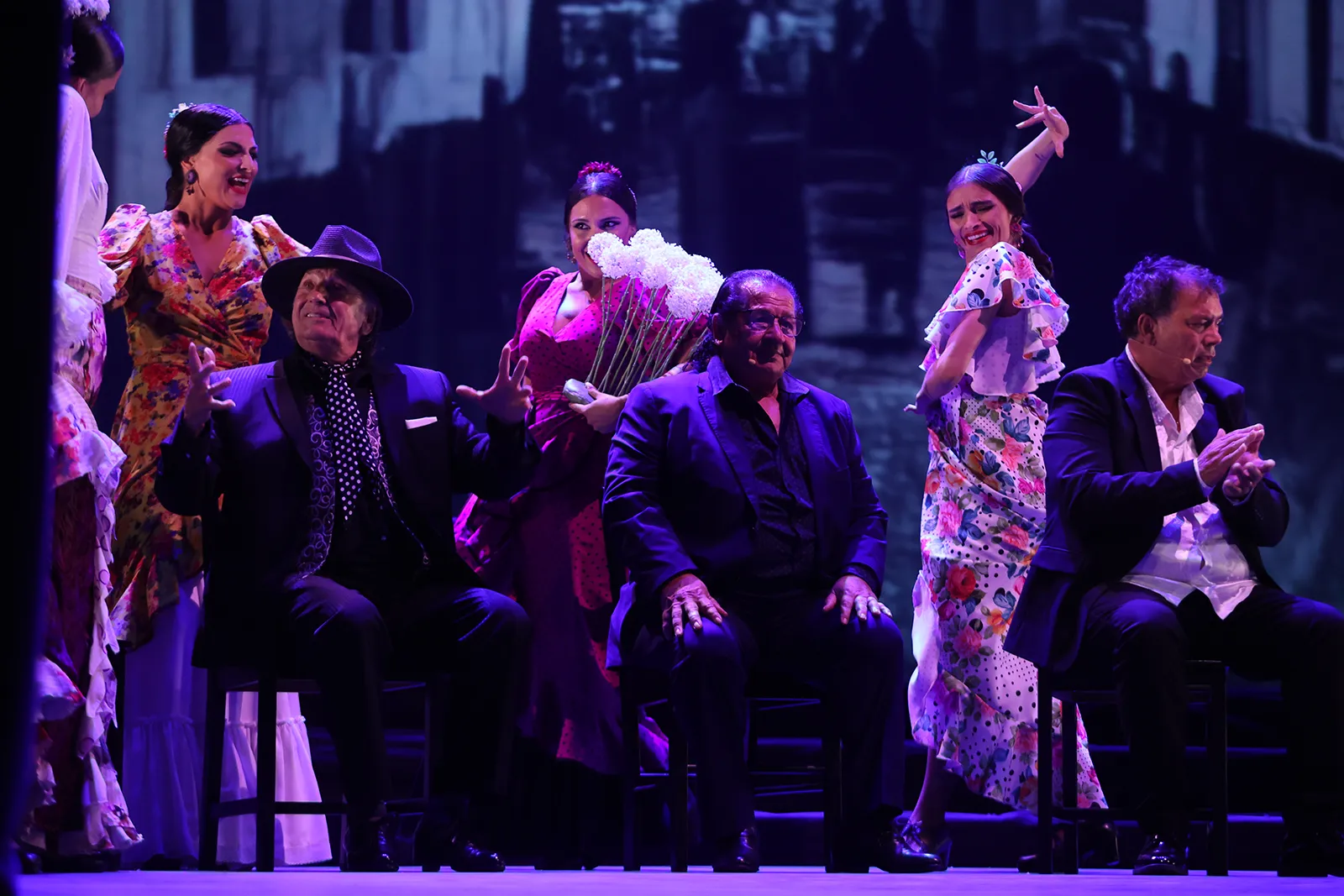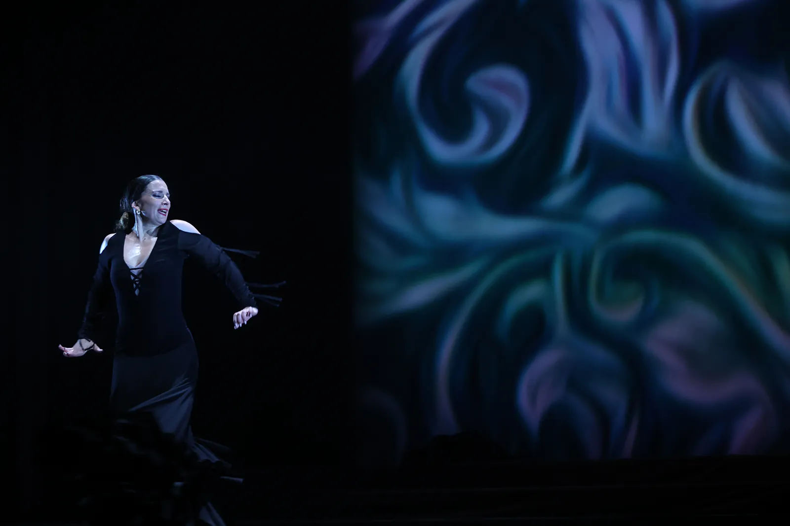 Pero todo tiene un final. La felicidad es efímera. Y así llegamos a la tercera etapa, la de la separación, la del despecho y la tristeza. Esos sentimientos nos los transmite Luisa Palicio en un número en el que baila al silencio, primero, y después, a la percusión precisa y evocadora de David Chupete, con la pantalla del fondo devolviéndole sus gestos. Si sus brazos y su cintura son la encarnación de la feminidad flamenca, la fuerza de sus pies en el zapateado es la rabia, la desesperación milenaria de la historia de este arte. Delia Membrive le canta por tientos, libre quiero ser como el pájaro que canta, primito, al amanecer, y Luisa, en un contraluz, se despoja de sus ropas y se enfunda –ahora sí– la bata de cola, y se dispone a ofrecernos un final sublime. La copla de Estrellita Castro La Camelia nos la canta otra malagueña excepcional, Pasión Vega, que con su gran personalidad, su magnífica voz y su interpretación de gran hondura sentimental genera un momento de gran complicidad con el baile introspectivo y doliente de Luisa Palicio. Ambas crean una atmósfera mágica, consiguiendo atrapar al público dentro de ella y estremecerlo. La carga emocional es tan intensa en ambas que consiguen la catarsis del espectador.