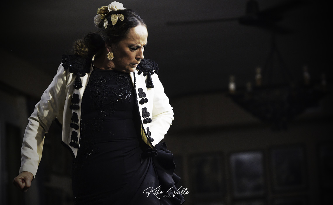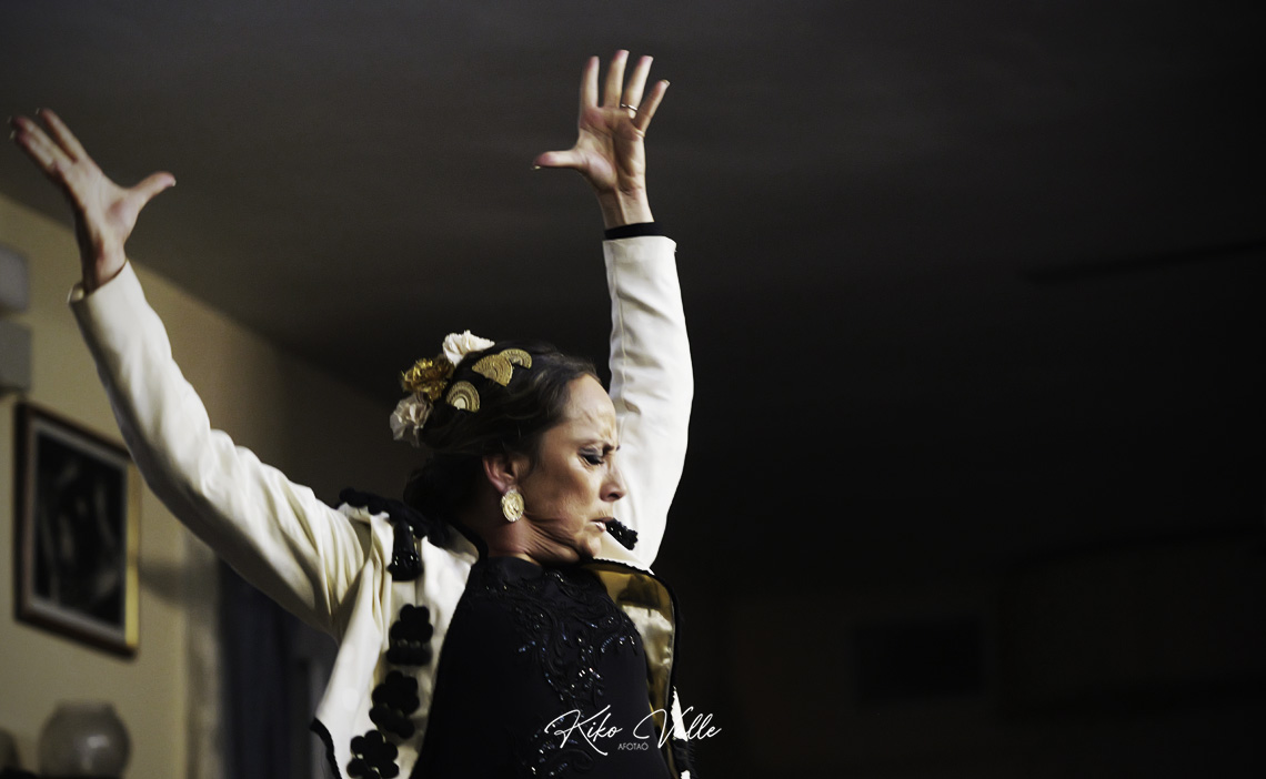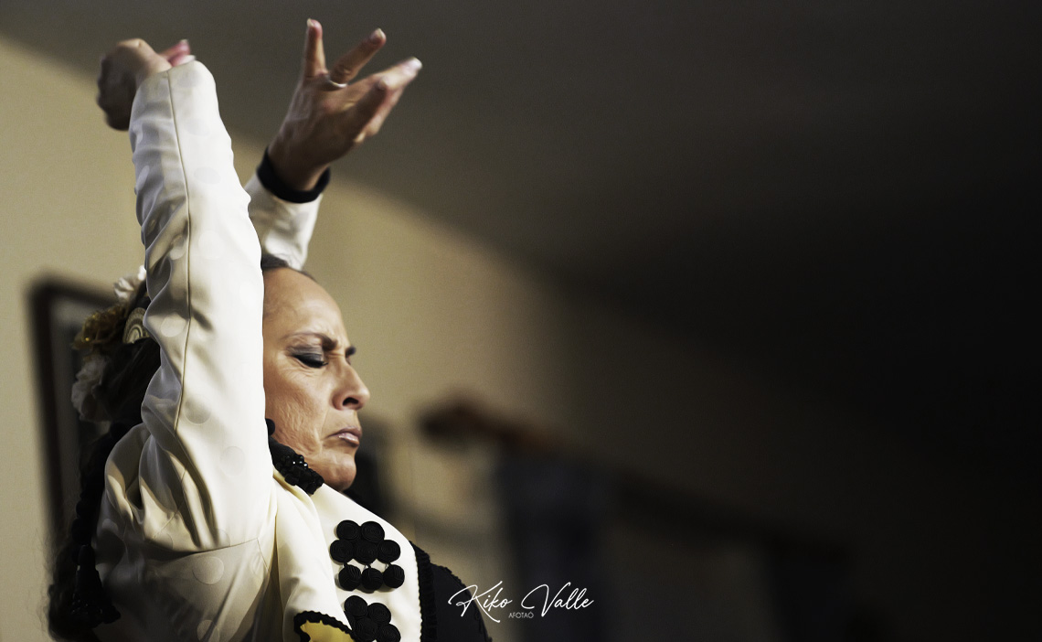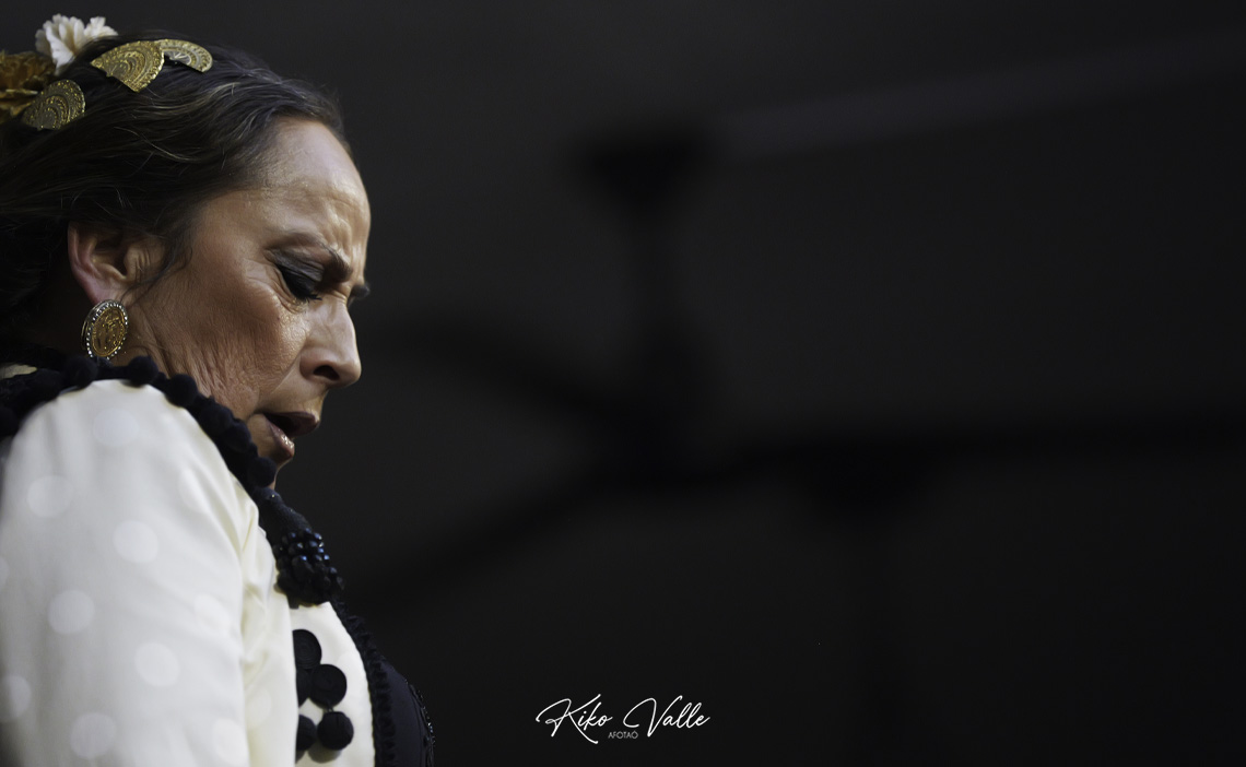 Por seguiriya se rebuscó en las caderas recias el dolor que la atravesaba, poderosa e hiriente, reflejándolo en su cara. Espontánea y segura, fuerte en las embestidas pero sabiendo pasear y brillar en los silencios paraos, colocaba los pies en su sitio y esbozó un braceo flamenquísimo. En la soleá por bulería, más redonda y picarona, meneó su cintura y el culo con age, recogiéndose con empaque el vestío. Llamadas y escobillas clásicas, zapateaos de trapío… Carmen Lozano le bailó más que bien al cante de su marido, a la guitarra de Ñoño y a las palmas de Fali del Eléctrico y de sus hijos Juan Carlos y Rafael Usero, conformando la comunión del arte en la Peña Flamenca Torres Macarena.