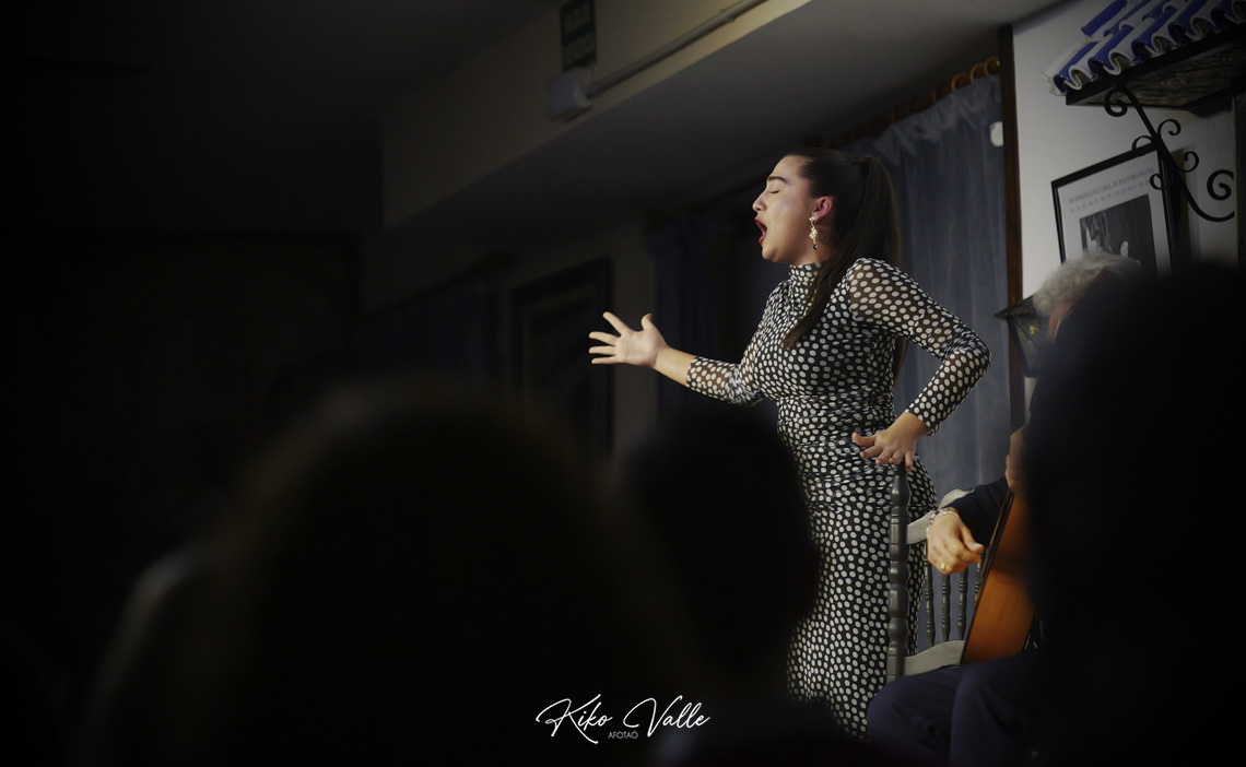 Sólo dos sillas en el escenario. Consuelo Haldón viene acompañada por el magnífico guitarrista Antonio Carrión, el que ha tocado para lo más grande que ha dado la historia del flamenco desde la segunda mitad del siglo XX hasta nuestros días, y lo que le queda. Toma su silla de la mano y Carrión comienza a templar su guitarra para darle el tono. Consuelo inicia su actuación desde los fondos más profundos de la toná, con su voz perfecta, con una afinación sin error, una colocación de la voz sorprendente, dominando bajos, medios y altos con naturalidad y fuerza. Y ese respeto a las raíces que todo artista tiene que mostrar. Es tan joven (Paymogo, 2007) y a la vez es tan madura que sorprende su actitud. El primer cante ya ha despertado la afición que el público siente en sus entrañas y le regalan aplausos y oles. Las miradas se entrecruzan entre los asistentes. ¿Qué está pasando? Pues nada más acaba de empezar.
