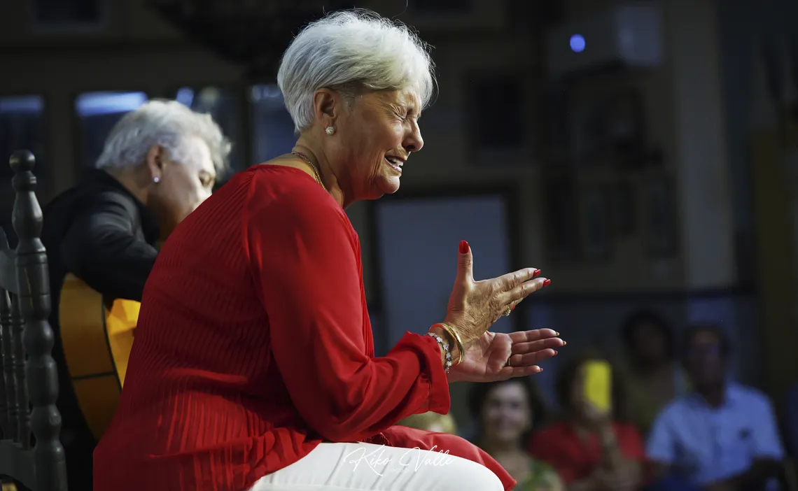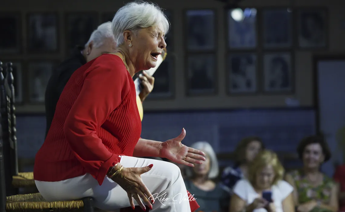 Afirmó con rotundidad que estaba rifá entre los compañeros y que no se sintió mal por ser en muchas ocasiones la única artista de los carteles, pretendiendo siempre dignificar el papel de la mujer en este género, como pudimos comprobar en un surtido de grabaciones sonoras –por granaínas, alegrías, soleá por bulerías o seguiriyas– y audiovisuales a las que fue dando entrada Ángeles Cruzado antes de que Tina nos deleitara con un recital de pequeño formato en el que se templó por malagueñas y abandolaos, soleá y bulerías –aquí levantó al público con la Maja Aristocrática de Pastora–, al arrullo de la bajañí infalible de Antonio Carrión.