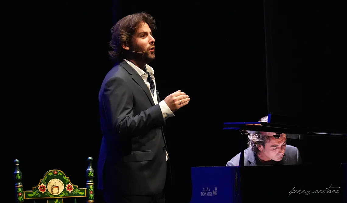 Juanelo principió por tonás a la orden del yunque, endiñando los primeros pellizcos hasta enfilar el cierre con el pan moreno. Se bamboleó con los aires lebrijanos por cantiñas acordándose de Pinini. Bordó unas malagueñas al piano, poniéndoles el sombrero abandolándose por rondeñas, sin acancionarse, siempre flamenco, regodeándose en la sensibilidad de los marfiles de Pedro Ricardo Miño. Pegó un bojigazo por Gaspar de Utrera para abrir los tientos tangos y luego vinieron los ayes y el eco lastimero haciendo del cante un monumento con el piano jondo de Richard. Tremendo. Después vino la soleá, canónica y solemne. Un romance de gañafones con el baile colmao de gitanería de la tita Carmen Ledesma –apoteósica– que le bailó al cante como nadie sabe. La seguiriya punzante y doliente, echando allí las asaúras, luego zambra, bulerías… con El Lebrijano y El Turronero en vena. Y el Corazón loco de Bambino.