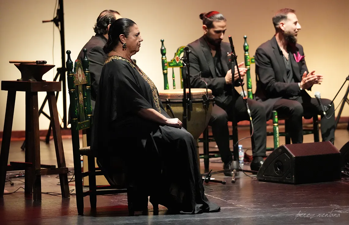 Tete Peña a la percusión, Manuel Valencia y El Petete a las palmas –¡qué peaso pataíta se dio al final de la noche y vaya soniquetazo que pusieron los dos al asunto!–, tres guitarras de Utrera: Antonio Moya, Antonio Santiago ‘Ñoño’ y Alejandro Fernández –soberbios los tres, y… ¡qué enjundia la de Moya, qué musicalidad en la composición la de Ñoño, qué finura en el toque tiene Alejandro!–, el piano flamenco del trianero Pedro Ricardo Miño –sensible y elegantísimo– y el baile racial de Carmen Ledesma. Todos ellos conformaron un espectáculo de altura que hizo las delicias de los presentes, arrancando espuertas de oles y erizando los vellos del respetable a cada rato.