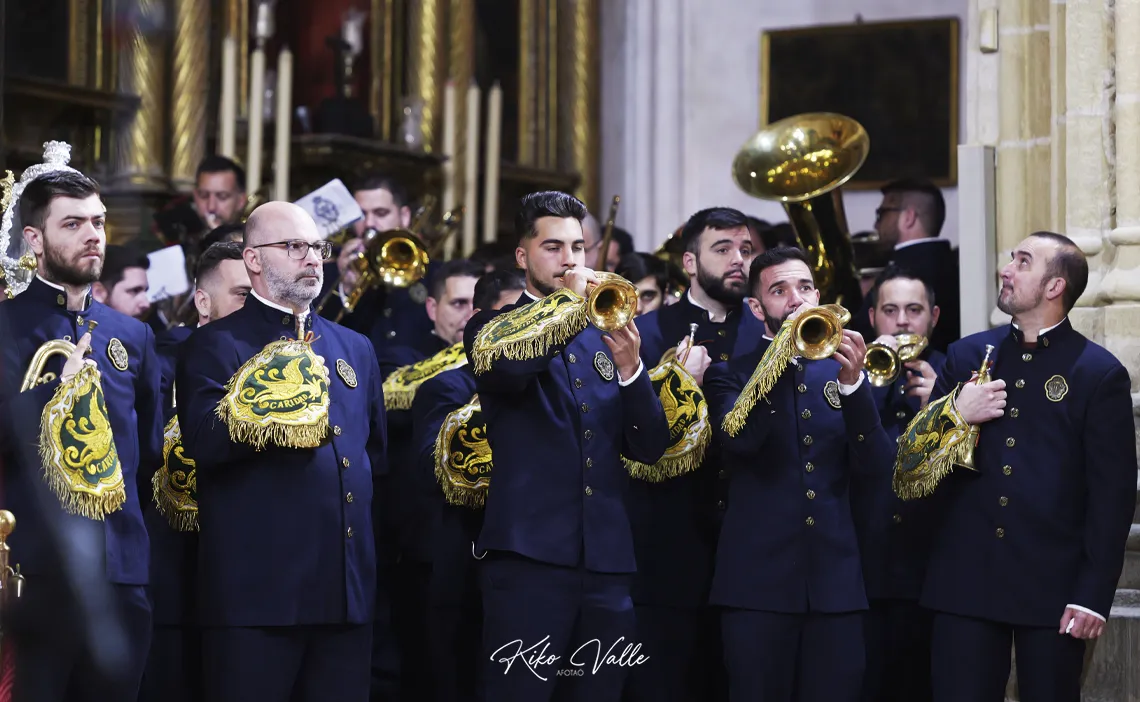La Banda de Cornetas y Tambores ‘Caridad’ tronó en el templo gótico del siglo XV alternando entre la palabra y las saetas, jalonando con tres marchas sublimes la exaltación. Abrió con Bulería en San Román, de José Pavón, sedujo con El alma de Triana, de Francisco Ortiz, y atizó un Azote de fe, de Nicolás King y Carlos Belmonte, para luego abrochar el cierre con la Marcha Real.