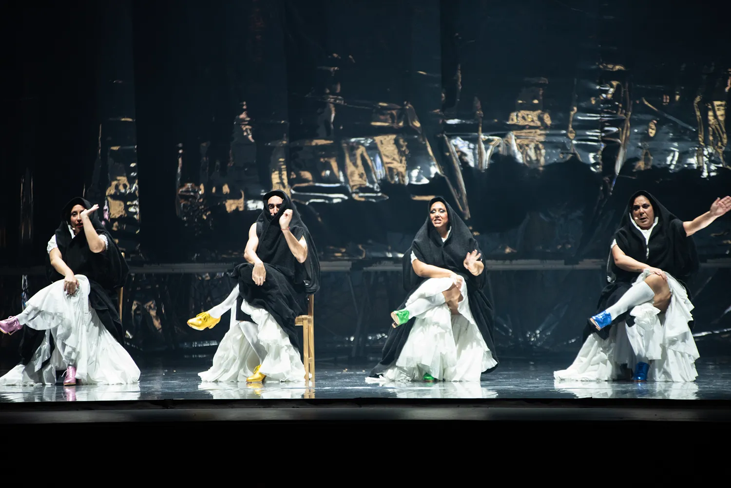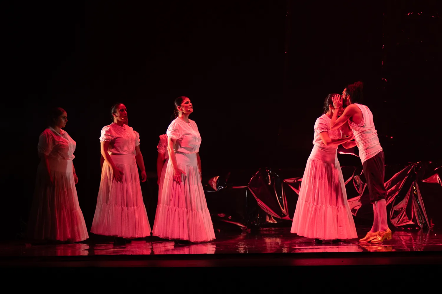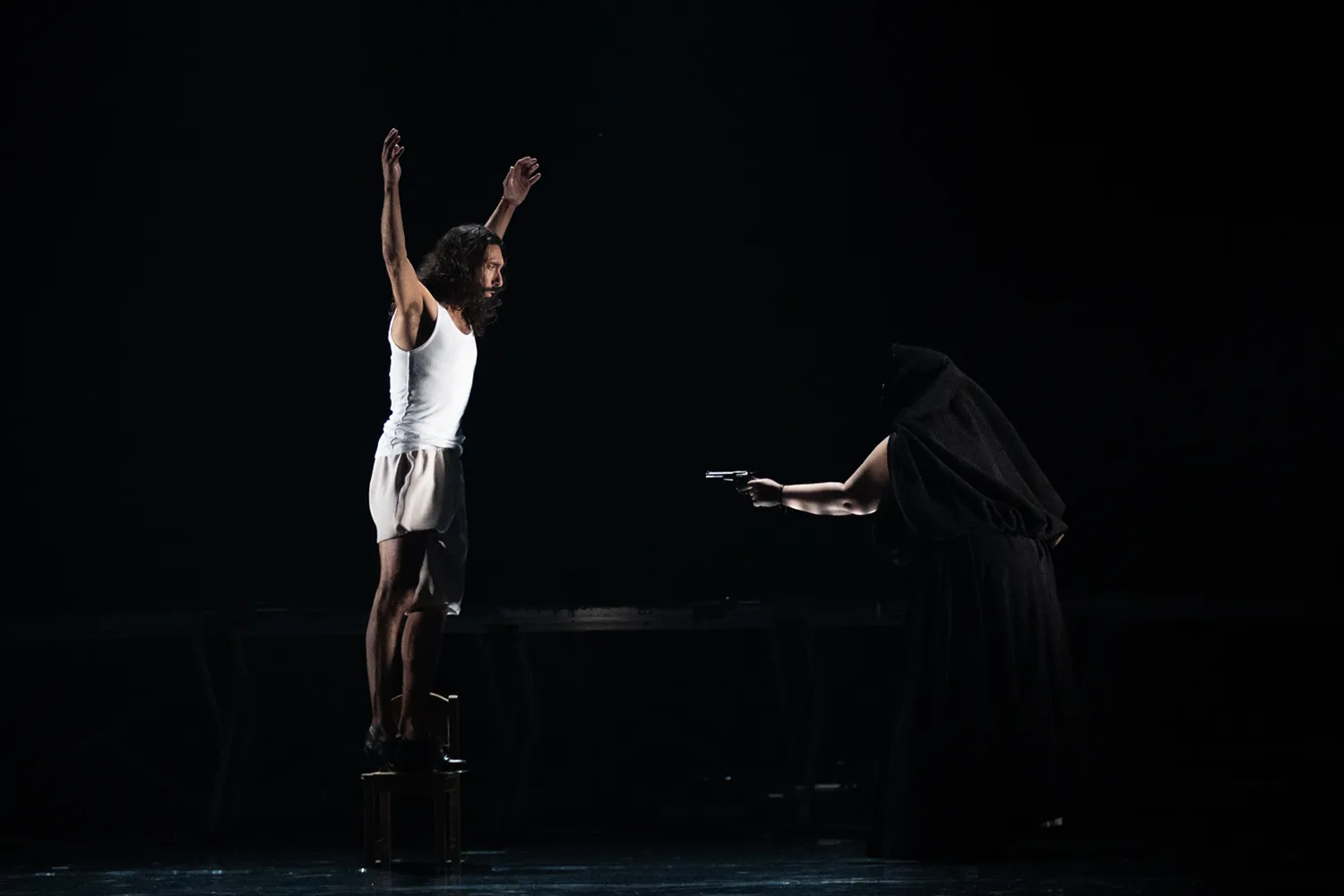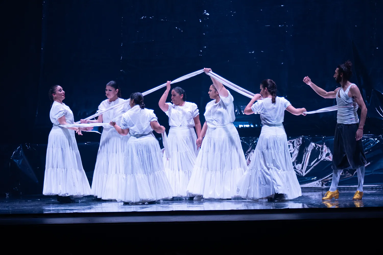 Guerrero, forzando un poco la realidad histórica, esgrime en el texto del programa esa prenda como símbolo de libertad y de resistencia. Sin embargo, el fantástico paseíllo que hace sostenido por estas mujeres, desgreñado y exánime como un cristo barroco, es puro surrealismo del que lo mismo brota un globo de helio que un teléfono con el que hacerse un selfie. No menos surrealista resulta la siguiente escena, en la que una de esas cobijás apunta al bailaor con un arma y lo hace bailar sobre una silla… para terminar alcanzando al guitarrista Pino Losada.