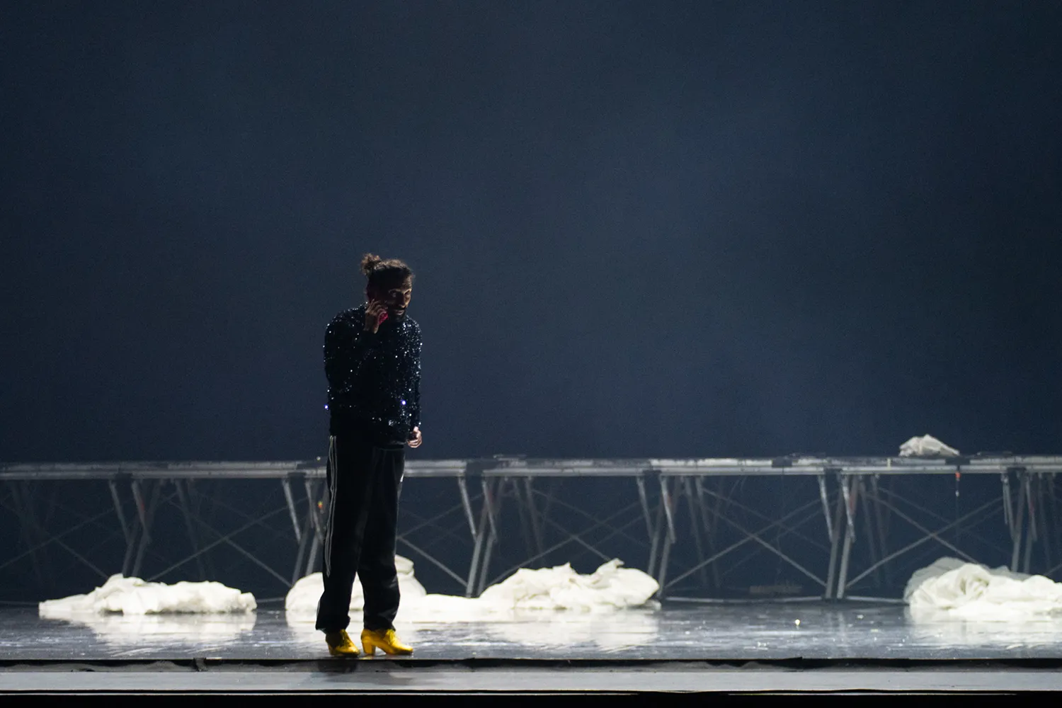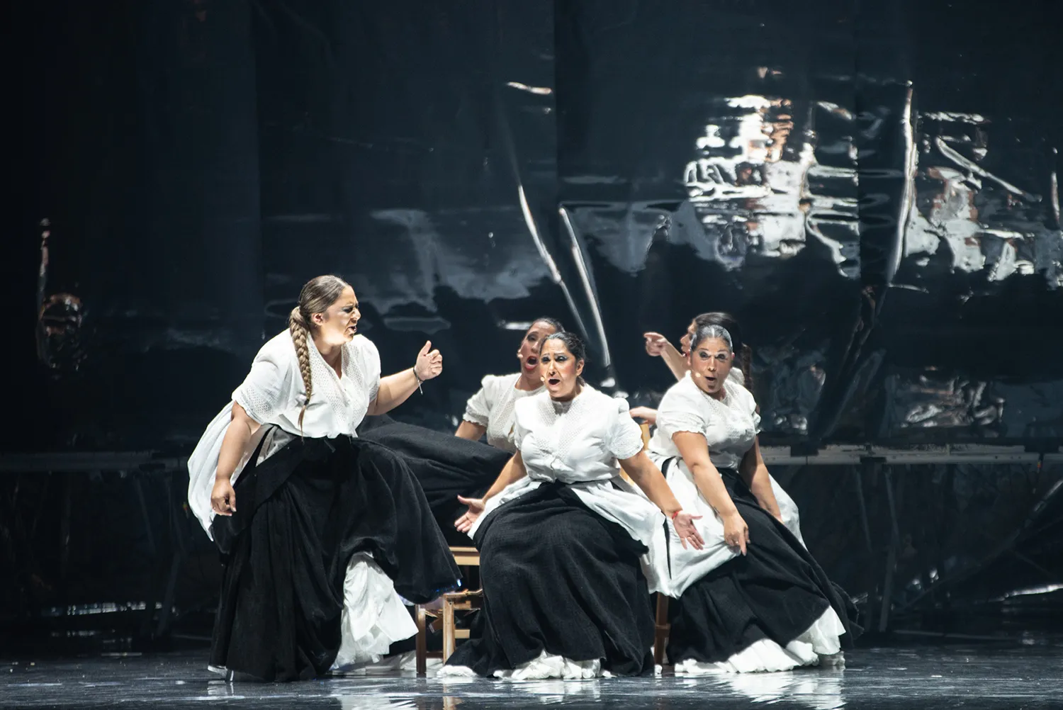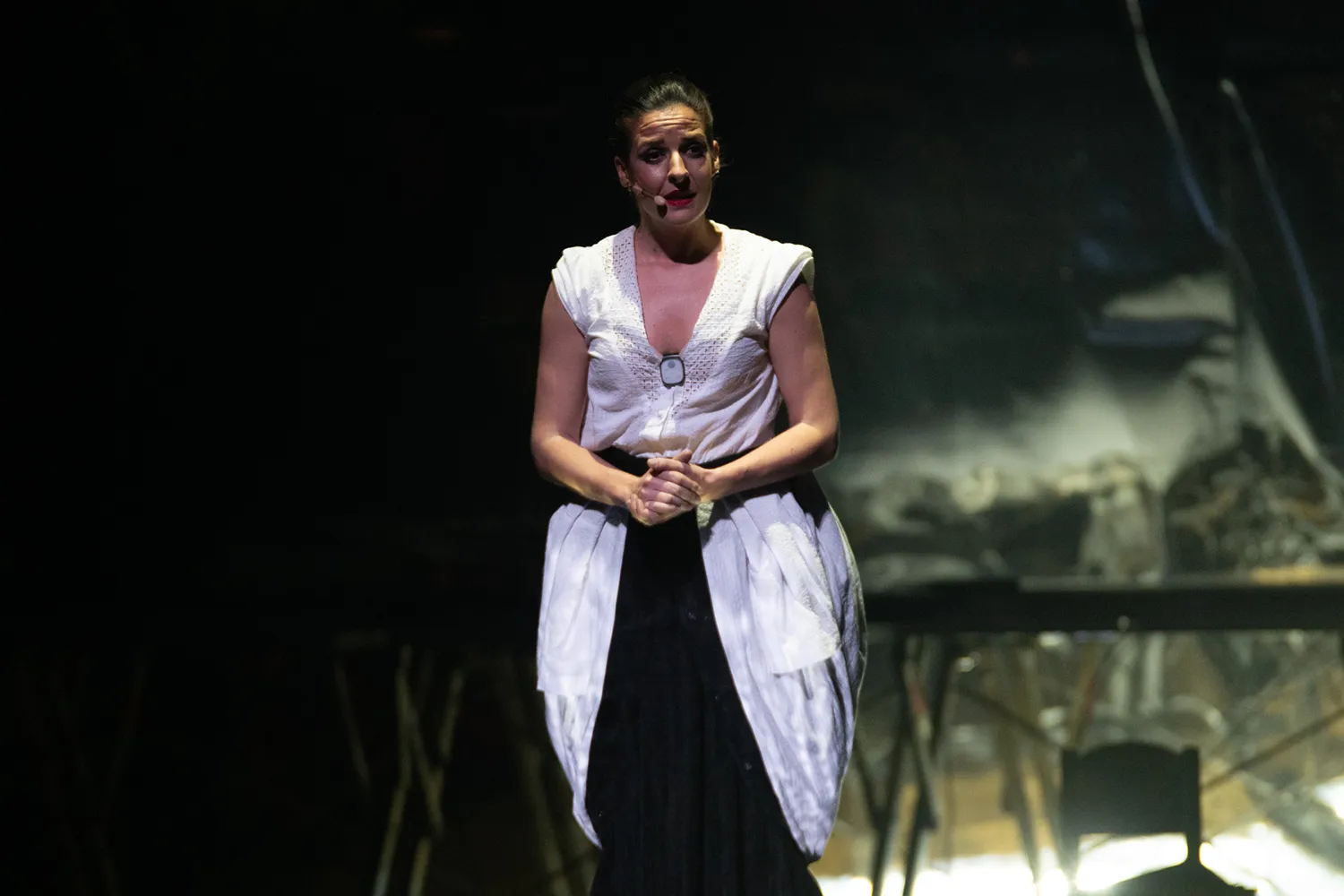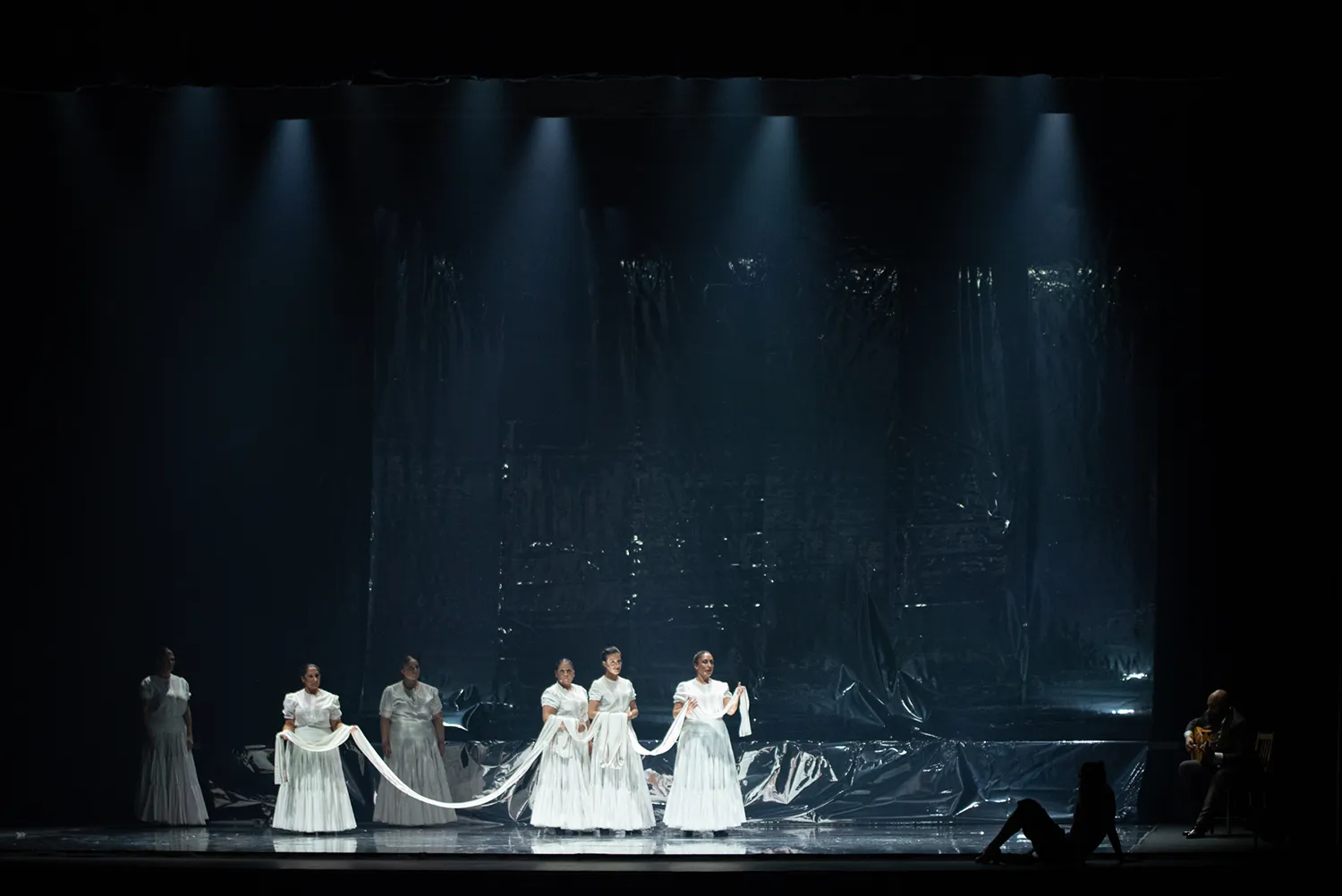 Guerrero, forzando un poco la realidad histórica, esgrime en el texto del programa esa prenda como símbolo de libertad y de resistencia. Sin embargo, el fantástico paseíllo que hace sostenido por estas mujeres, desgreñado y exánime como un cristo barroco, es puro surrealismo del que lo mismo brota un globo de helio que un teléfono con el que hacerse un selfie. No menos surrealista resulta la siguiente escena, en la que una de esas cobijás apunta al bailaor con un arma y lo hace bailar sobre una silla… para terminar alcanzando al guitarrista Pino Losada.