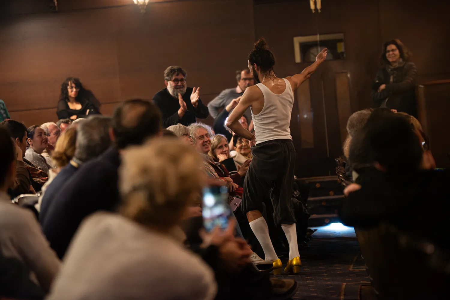 Aunque todo viene envuelto en cierto halo de misterio, acaso con una excesiva insistencia en lo poético (¿es María Zambrano a quien citan en algún pasaje?), el humor y el juego están presentes en una propuesta eminentemente visual, pero que va a ir dando cada vez más paso al baile. Los tanguillos con zapatos de colores, e incluso con luces incorporadas, conducen al juego de las sillas, y este a unos tangos donde Guerrero, ya convertido en una cobijá más, luce su baile más poderoso, imbatible en lo físico y arrebatador en lo emocional.