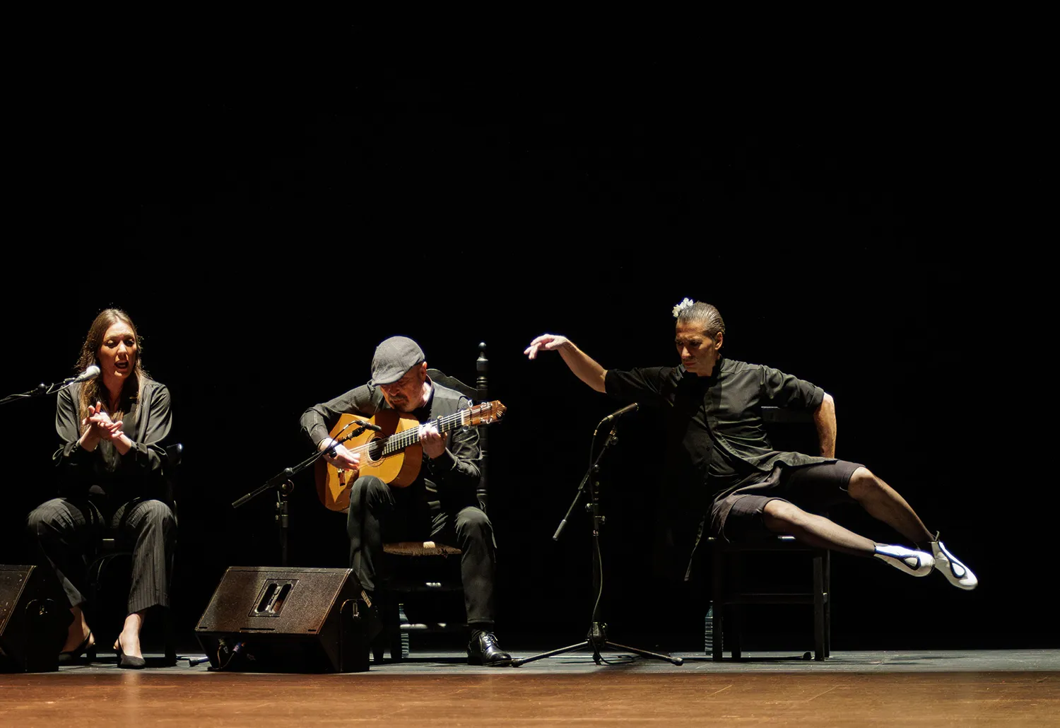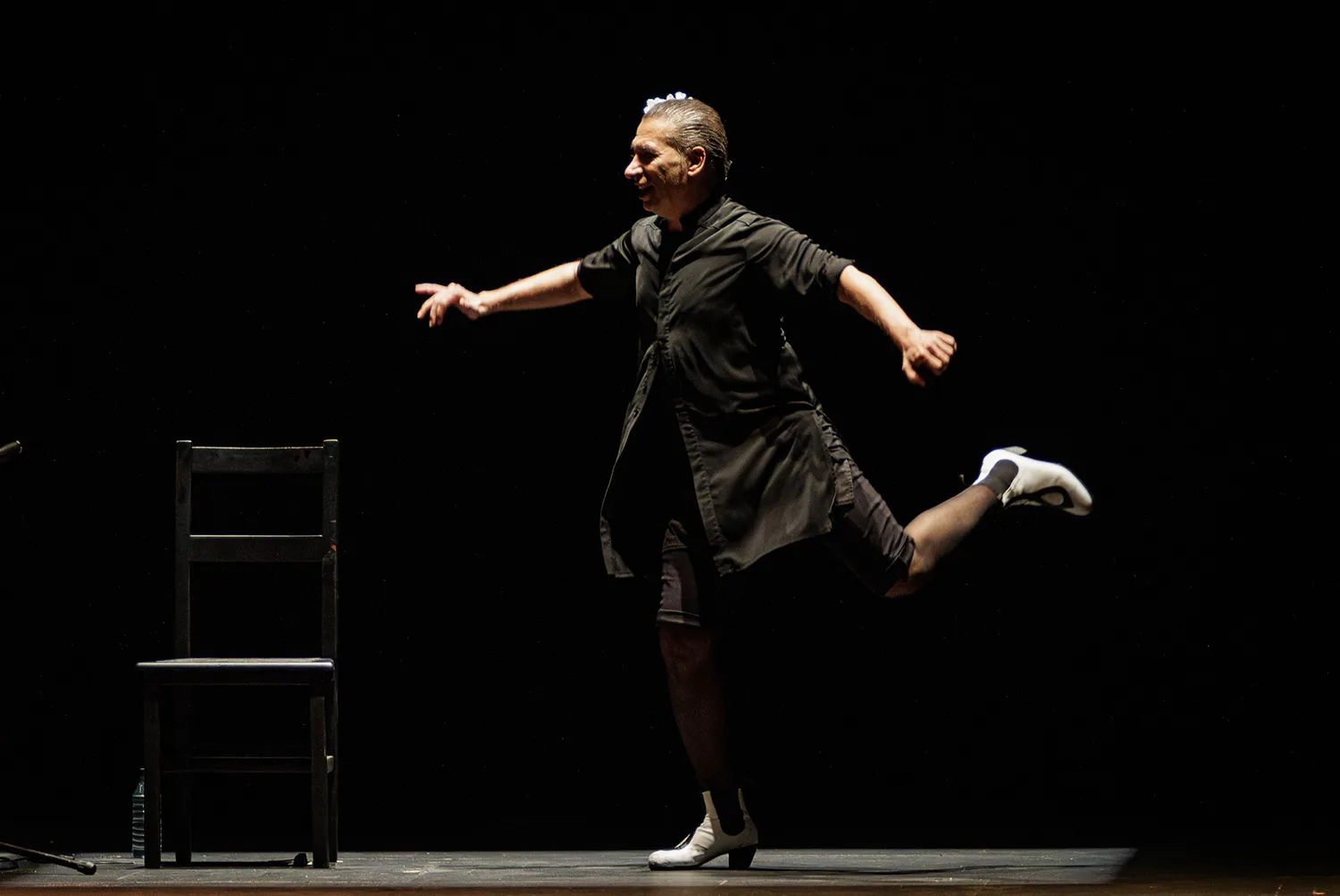 Es cierto que lleva veinte años reproduciendo y perfeccionando ese discurso, y todavía es motivo de asombro el modo en que ha conseguido fijar un lenguaje dancístico propio. Ni siquiera importa que algunos elementos los haya tomado prestados de otros, porque ya dijo Eugenio D’Ors que en arte lo que no es copia es plagio: ya son cosas de Israel. Me refiero a las figuras cubistas, la peineta con los dedos, los golpes de bota en la silla, las poses toreras, el redoble en los dientes, la mano como una hoja que cae, el remate de cabeza a un balón invisible… Lo mejor es que, superdotado para el compás y entrenadísimo para la improvisación como está, no se recrea en ninguno de estos recursos, sino que los alterna a una velocidad pasmosa para que la atención del público no se permita un pestañeo.