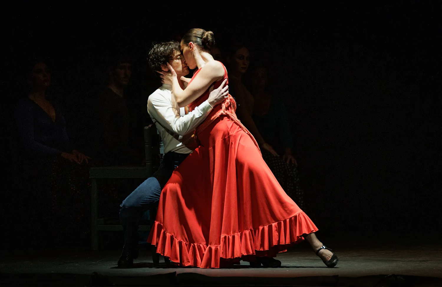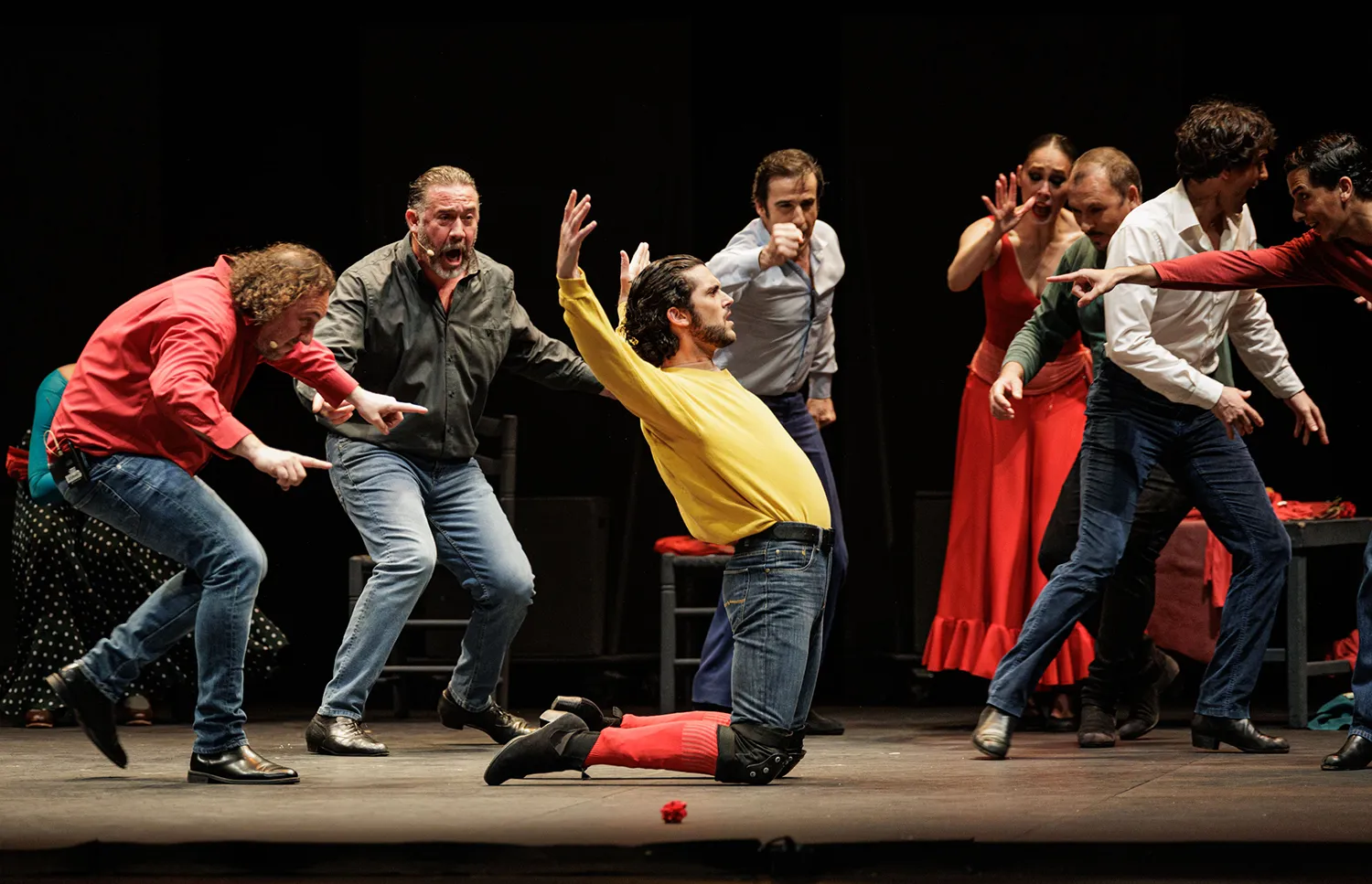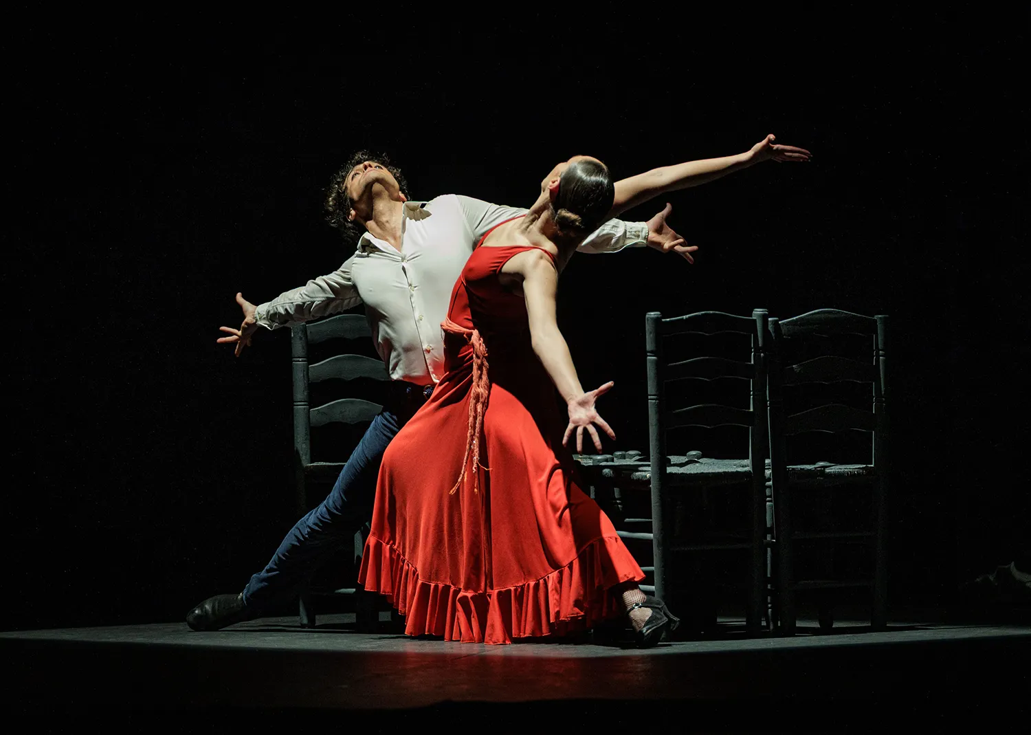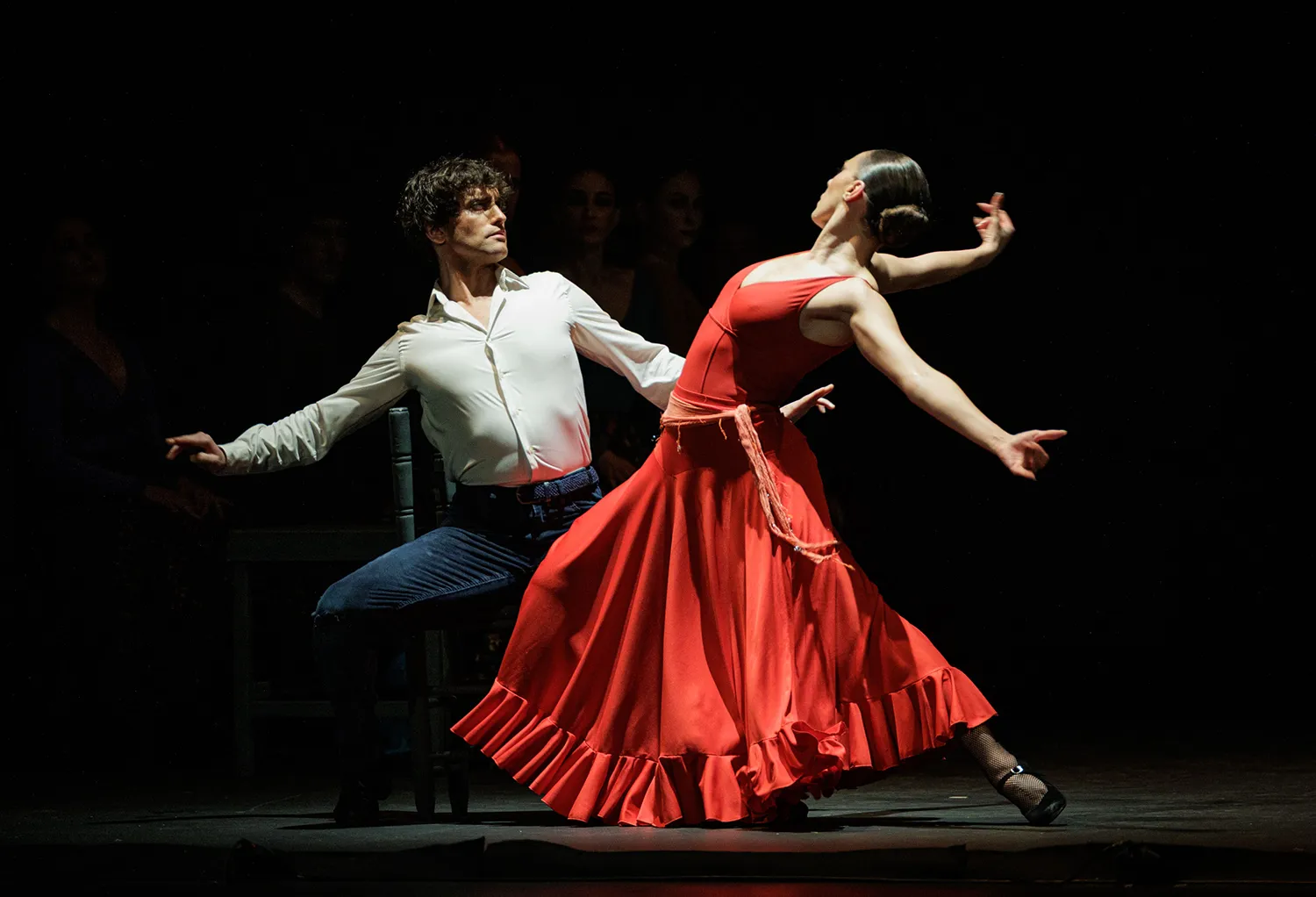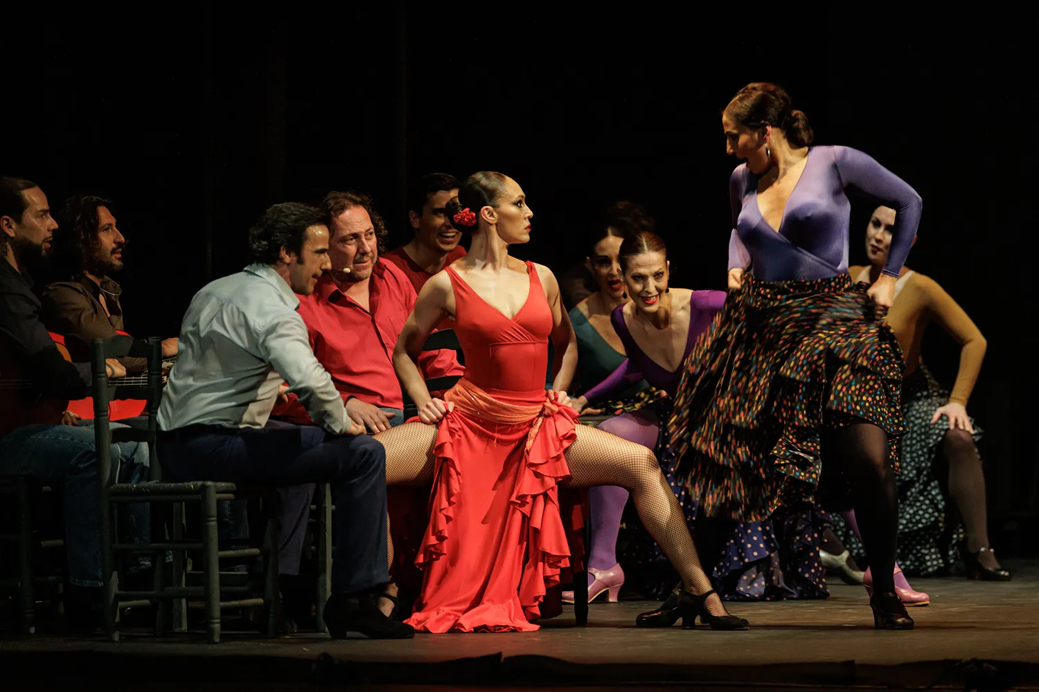 La disposición de las sillas a modo de cama o veladores de un bar, los espejos traseros como tocador o para academia de baile, las mesas a ambos lados del escenario como elementos percutivos, la guitarra de rasgueos sordos a marchas casi marciales, la tensión emocional de las disputas, las peleas de hombres enamorados con los bastones o las apuestas de cartas, la juerga, el cante, las sevillanas, la tragedia en la música operística, los jaleos, la iluminación, el vestuario, la guasa en la hilarante escena de una corrida de toros simulada, los besos sugeridos, el cortejo… Todo estuvo medido y mimado. Así como la elección de las letras de los cantes y la dualidad musical entre la flamenca o española y la ópera.