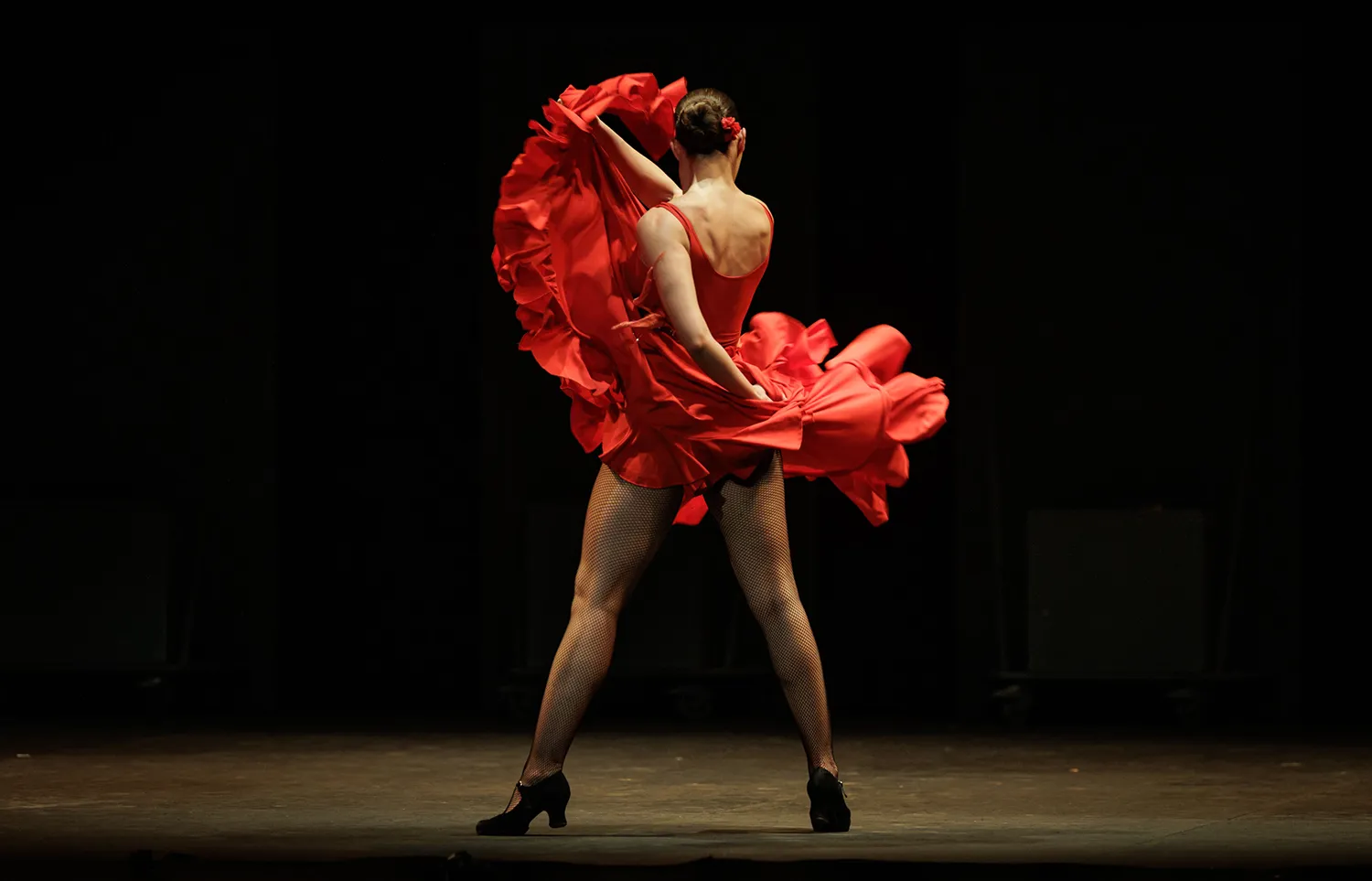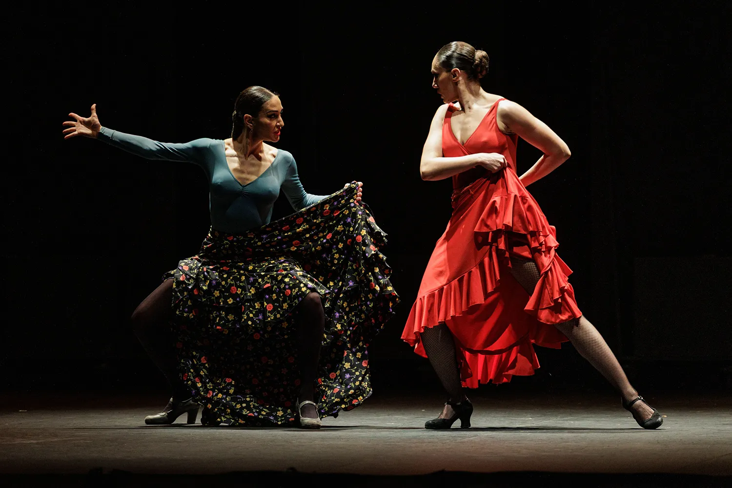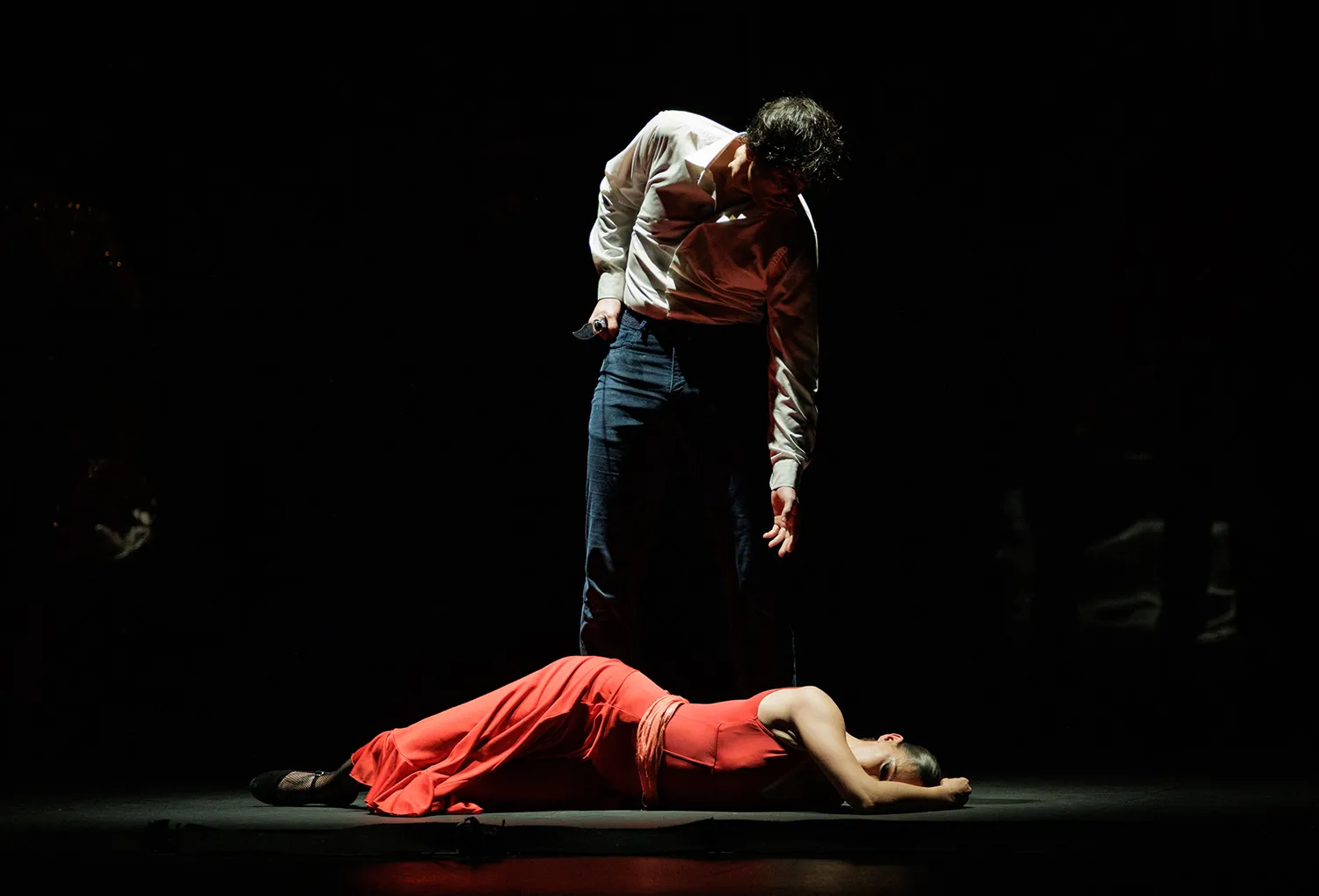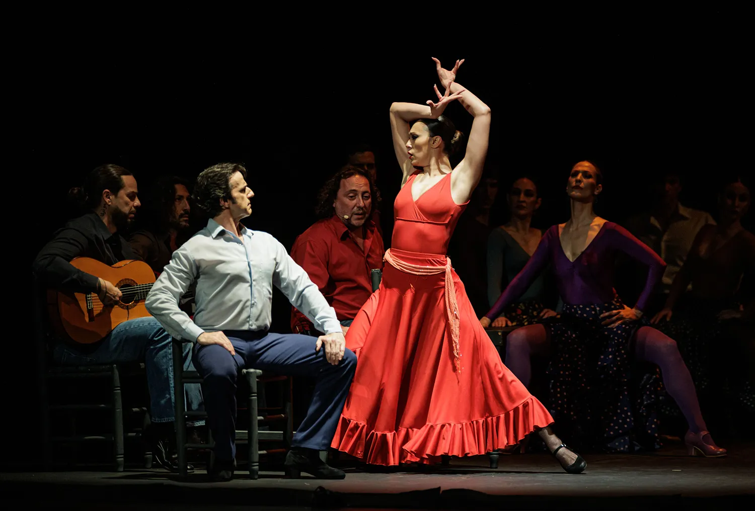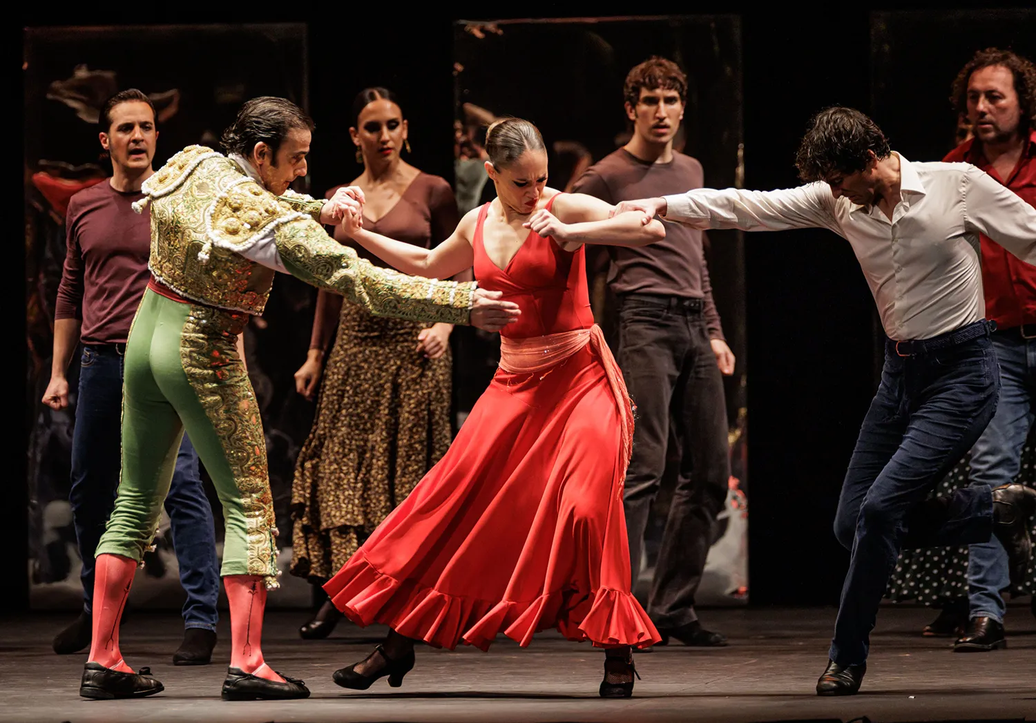 La disposición de las sillas a modo de cama o veladores de un bar, los espejos traseros como tocador o para academia de baile, las mesas a ambos lados del escenario como elementos percutivos, la guitarra de rasgueos sordos a marchas casi marciales, la tensión emocional de las disputas, las peleas de hombres enamorados con los bastones o las apuestas de cartas, la juerga, el cante, las sevillanas, la tragedia en la música operística, los jaleos, la iluminación, el vestuario, la guasa en la hilarante escena de una corrida de toros simulada, los besos sugeridos, el cortejo… Todo estuvo medido y mimado. Así como la elección de las letras de los cantes y la dualidad musical entre la flamenca o española y la ópera.