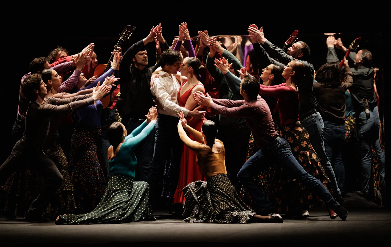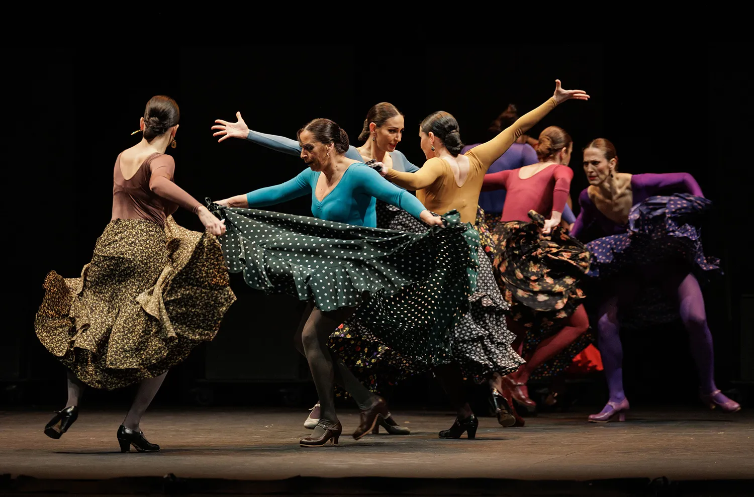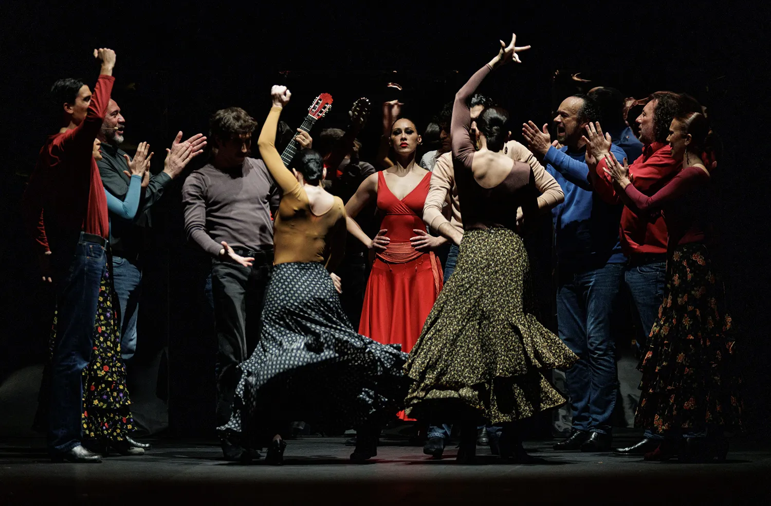 La coreografía siempre coordinada, el flamenco aparece por soleá, alegrías, sevillanas corales, el Verde que te quiero verde, las juergas y bailes grupales e individuales del ritual de lo jondo, las bulerías, el cuplé bambinero de Tejada con pataíta incluida, las tonás y en otros muchos momentos.
