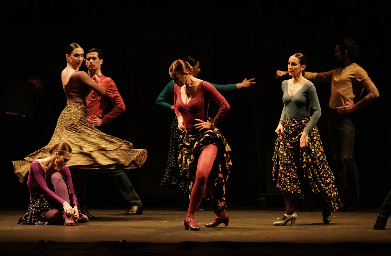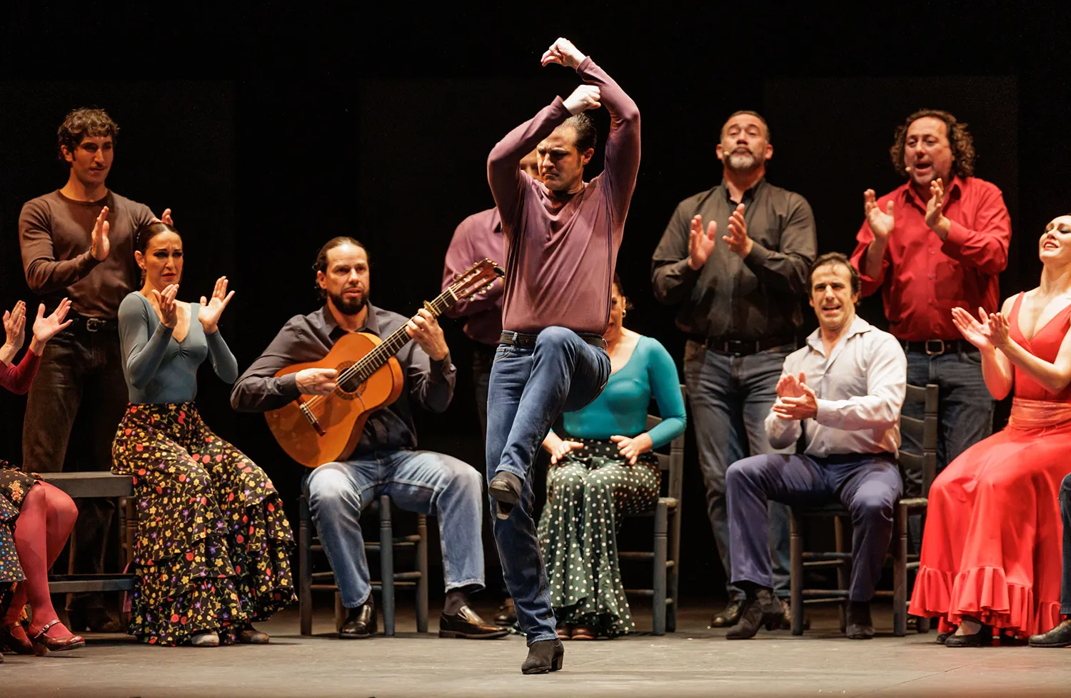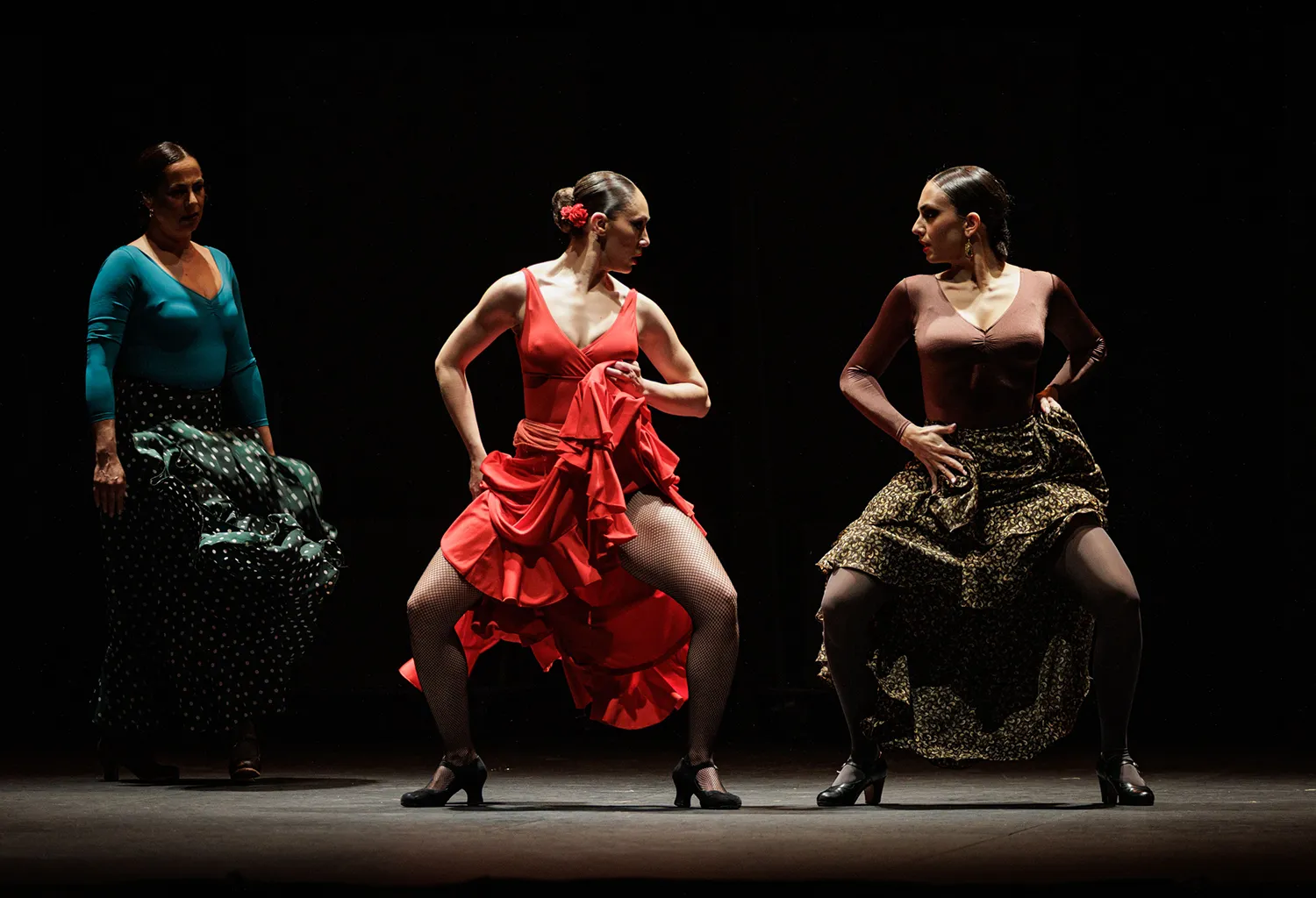 La coreografía siempre coordinada, el flamenco aparece por soleá, alegrías, sevillanas corales, el Verde que te quiero verde, las juergas y bailes grupales e individuales del ritual de lo jondo, las bulerías, el cuplé bambinero de Tejada con pataíta incluida, las tonás y en otros muchos momentos.