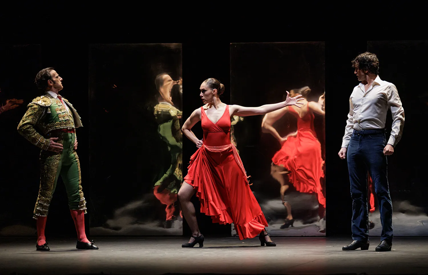 En una solución de continuidad donde se suceden las escenas con transiciones rápidas y fluidas, con pocos silencios y una pasmosa reconfiguración escénica de los pocos elementos que ocupaban el proscenio –sillas, mesas y unas estructuras de espejos movibles en el fondo del escenario–, la compañía muestra de manera clara y evidente el argumento sin caer en las referencias ramplonas que traducen al baile con literalidad el discurso narrativo. Y este no es otro que romper con los estereotipos de la mujer de aquella época y señalar su camino a través de la liberación en la entrega absoluta a sus propias elecciones en la vida, el amor o las relaciones carnales por las que se deja llevar sin ataduras. Carmen es una mujer joven, gitana, temperamental, seductora, sensual y enamoradiza, que cautiva al soldado don José y luego se encapricha con el torero Escamillo. El patriarcado reinante, los celos y los arrebatos emocionales de quien sufre el rechazo provocan la muerte de Carmen a puñaladas –la maté porque era mía– ante el sentimiento insoportable de compartirla con otro hombre o perderla para siempre por las decisiones amorosas en el ejercicio de su libertad.
