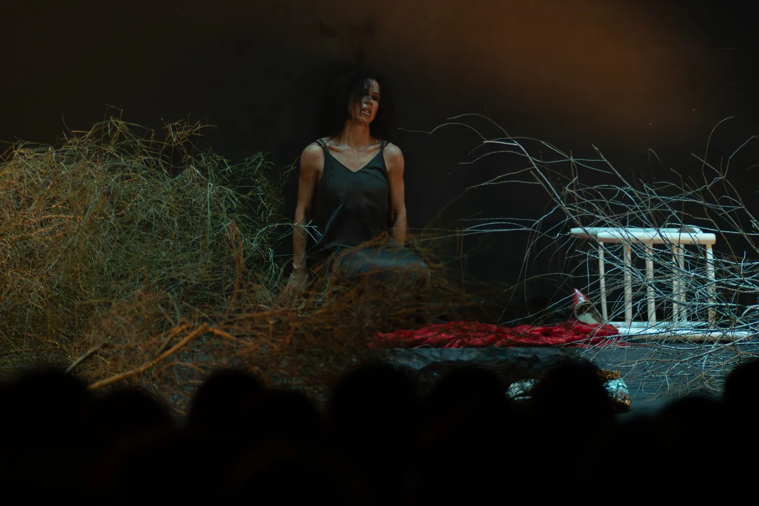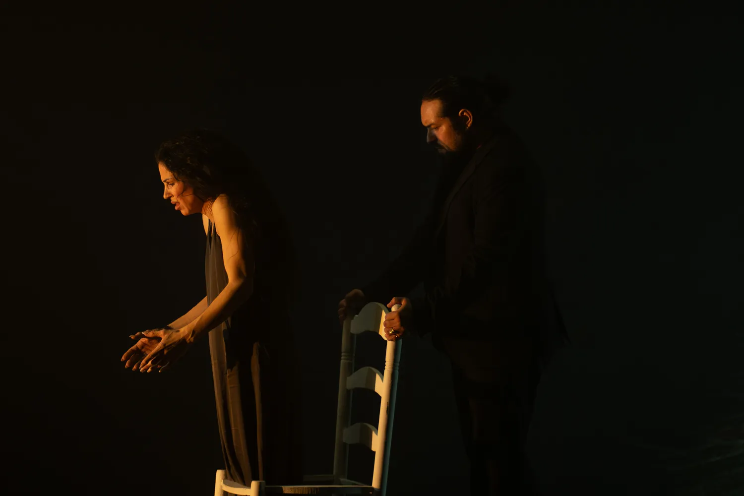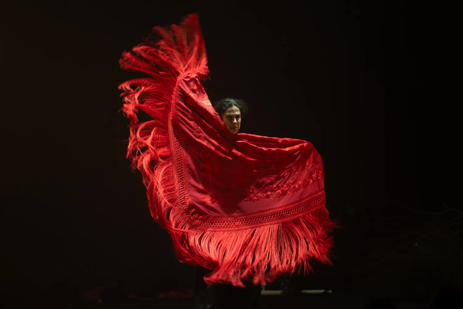 La señora bailaora de la obra se llama Rocío Garrido. Premio Desplante en el 2023 del Festival Internacional Cante de las Minas. Empieza con pantomima, la ausencia de sonido, mínimo movimiento. Luego, fragmentos auditivos que estimulan los sentidos y nos ubican en lo jondo. Granaína. La magnífica guitarra del joven David Caro que promete gloria. Se añade la voz de terciopelo viejo del subestimado Pepe de Pura. Bonito contraste cuando Esperanza Garrido pone su voz de miel tostada. Petenera fragmentada, alusiones a la caña, o al abandolao. Pepe de Pura pone orden con su siguiriya, y Rocío le responde con su baile temperamental.