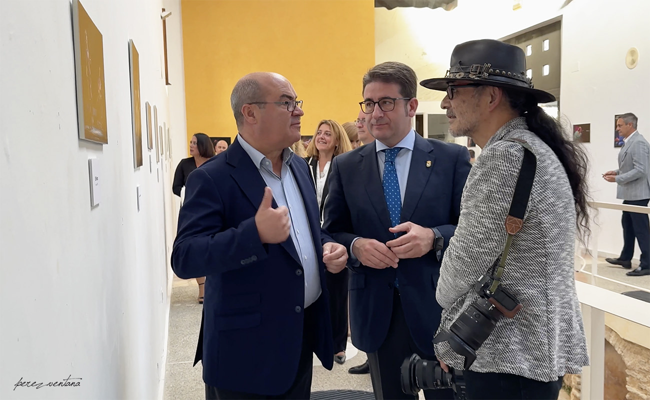El fotógrafo japonés Tomoyuki Hotta, en la inauguración de su exposición, con el alcalde Manuel Benjumea y el delegado de Cultura, Pedro Conde. II Festival Guirijondo. Hacienda Ulloa, Palomares del Río (Sevilla). 1 mayo 2024. Foto: perezventana