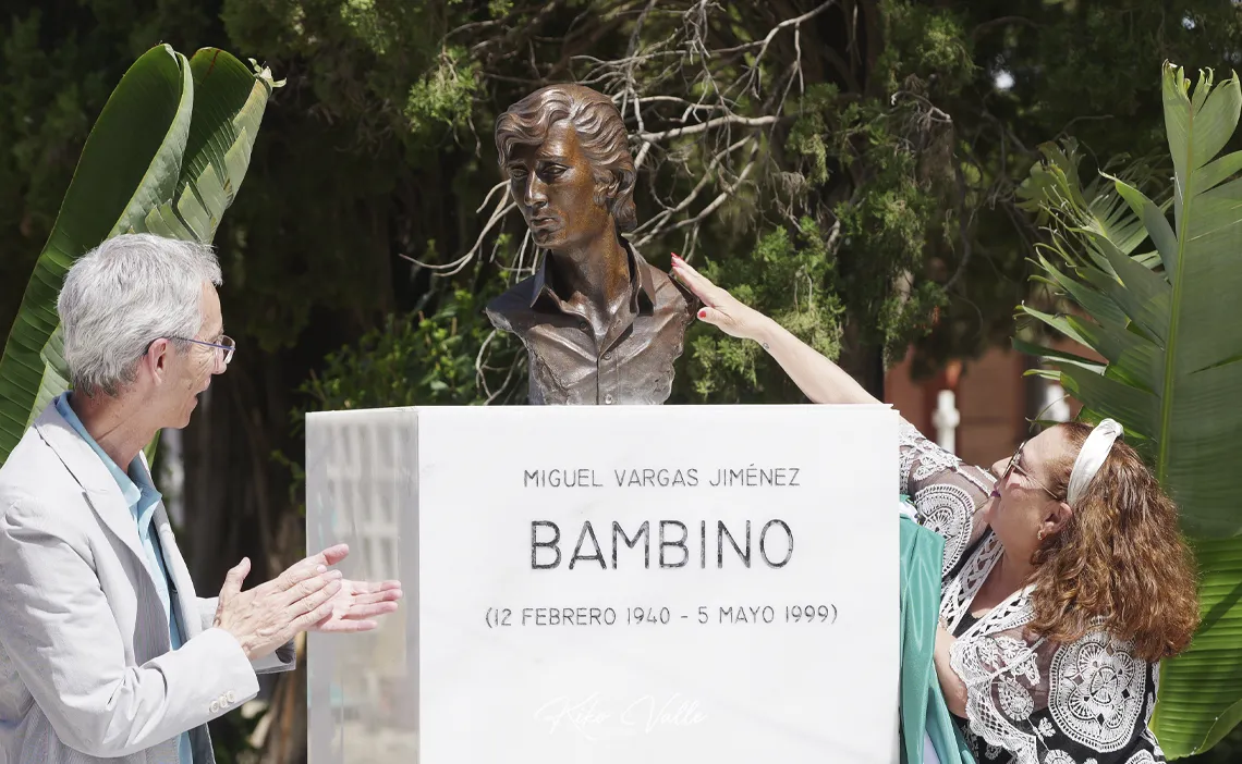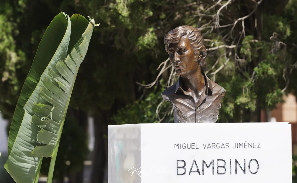 Durante la inauguración, se ha presentado el primero de los dos monumentos que pasarán a formar parte del patrimonio cultural de Utrera, un busto a tamaño natural realizado en bronce fundido por el escultor José Francisco Blasco Rivero, que lo ha donado para el pueblo. «No dudé en donarlo cuando me dieron la oportunidad de realizar este trabajo, porque el poder hacerlo yo, es un regalo que me ha dado la vida», ha explicado el autor, que ha querido transmitir en su escultura «paz y serenidad, sin que se perdiera la elegancia de la esencia de Bambino».