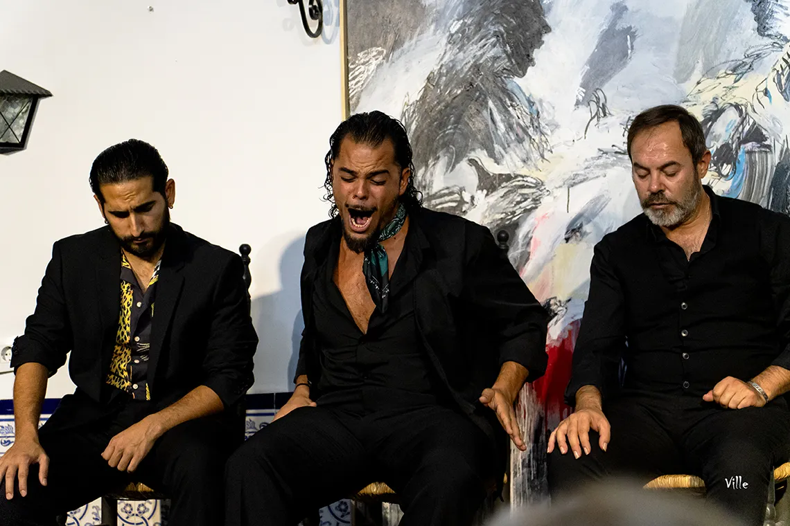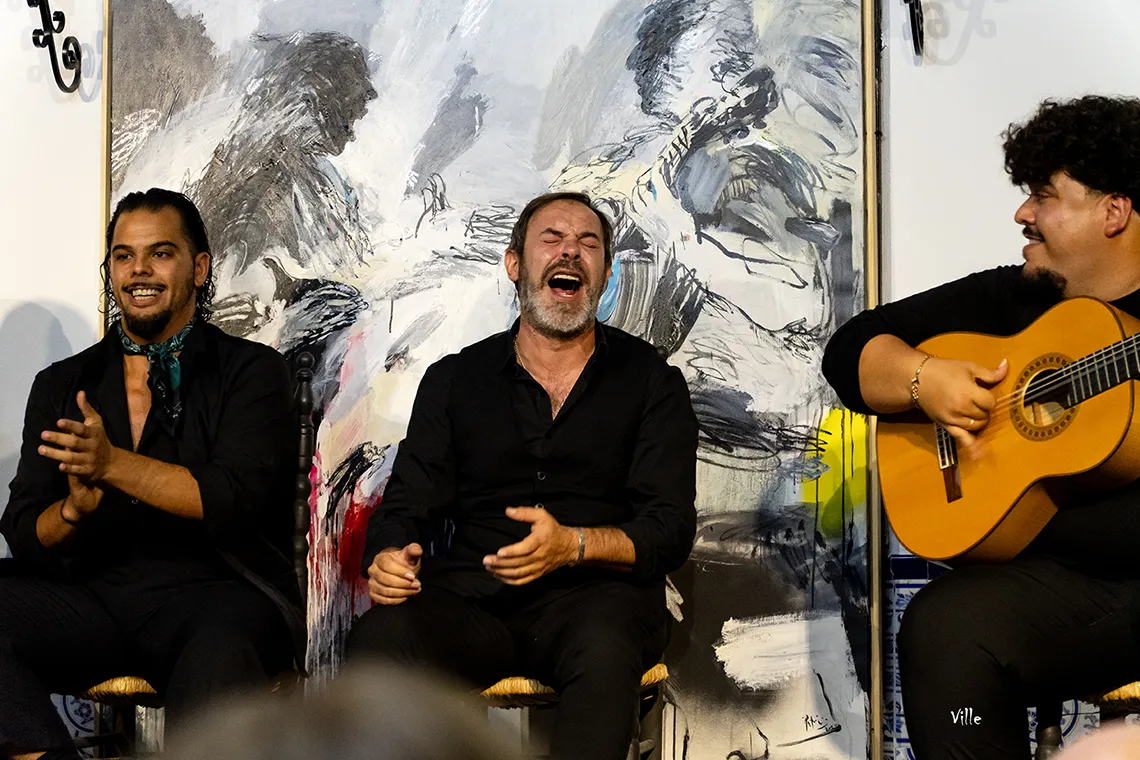 Rompió el silencio como de costumbre un solo de guitarra. Jesús derramó una espuerta de virguerías con sensibilidad, chorreando trémolos, para perfumar el ambiente. Luego llegó el Levante a la nuez de El Galli que masticó el cante preñao de soníos negros en el taranto. Hizo lo propio el de la Nina y arribaron a los tangos, acordándose de Juana la del Revuelo. Con un salpicón de sal se acercaron las alegrías a los maderos y José bailó como le dio la gana. Estalló la peña. Después enjaretaron los cantaores una ristra de abandolaos como preludio de una soleá solemne, tremenda, colosal… en la que cantó José pa comérselo –no sé si me gusta más bailando o cantando– y que remató por bulerías para coronar su propuesta recibiendo una ovación de las gordas de esta ensolerada casa.