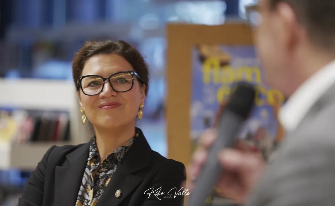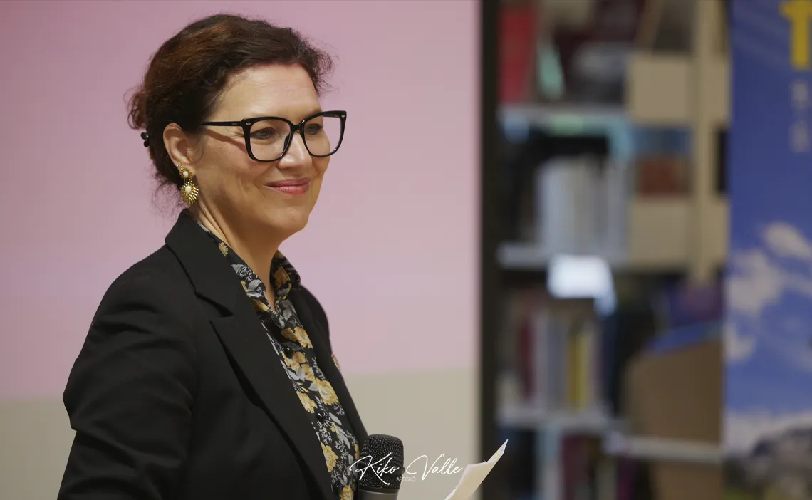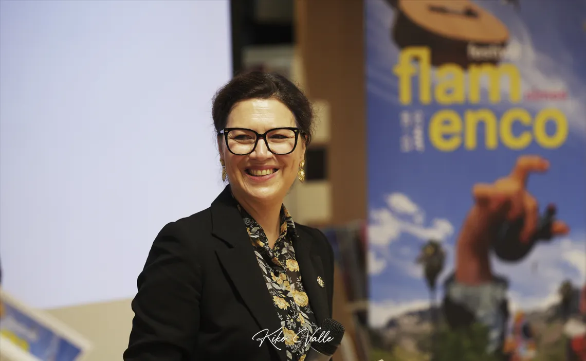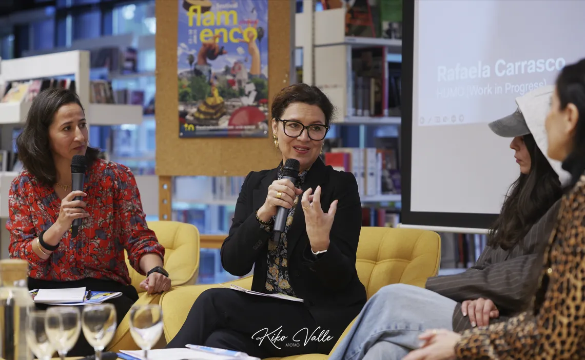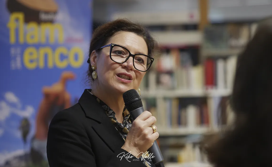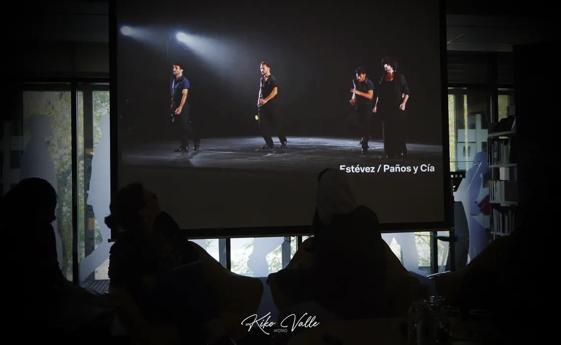 Amélie agradeció el apoyo al Instituto Francés y la asistencia a Rafaela y Ángela antes comenzar a detallar la programación. Aportó primero algunos datos del Teatro de Nimes, un espacio público y convencional –especializado en danza por el Ministerio de Cultura en Francia– que ella dirige desde 2023. Ofrece aproximadamente sesenta espectáculos por año que reportan un total de unas ciento treinta actuaciones donde el flamenco es, sin duda, el plato fuerte de la temporada. Aspira a contentar a la gran afición nimeña y a los que acuden de fuera conjugando tradición y modernidad en la que se ha convertido ya en la ciudad francesa más española. No en vano, es un territorio en el que habita un nutrido grupo de vecinos de este país.