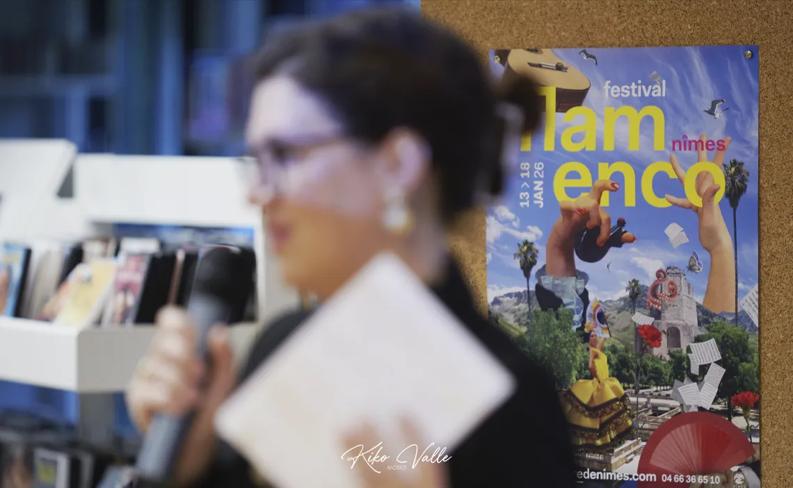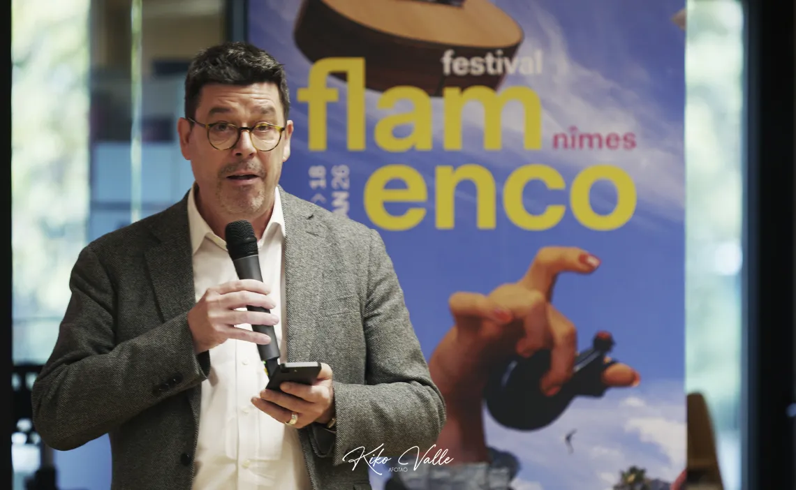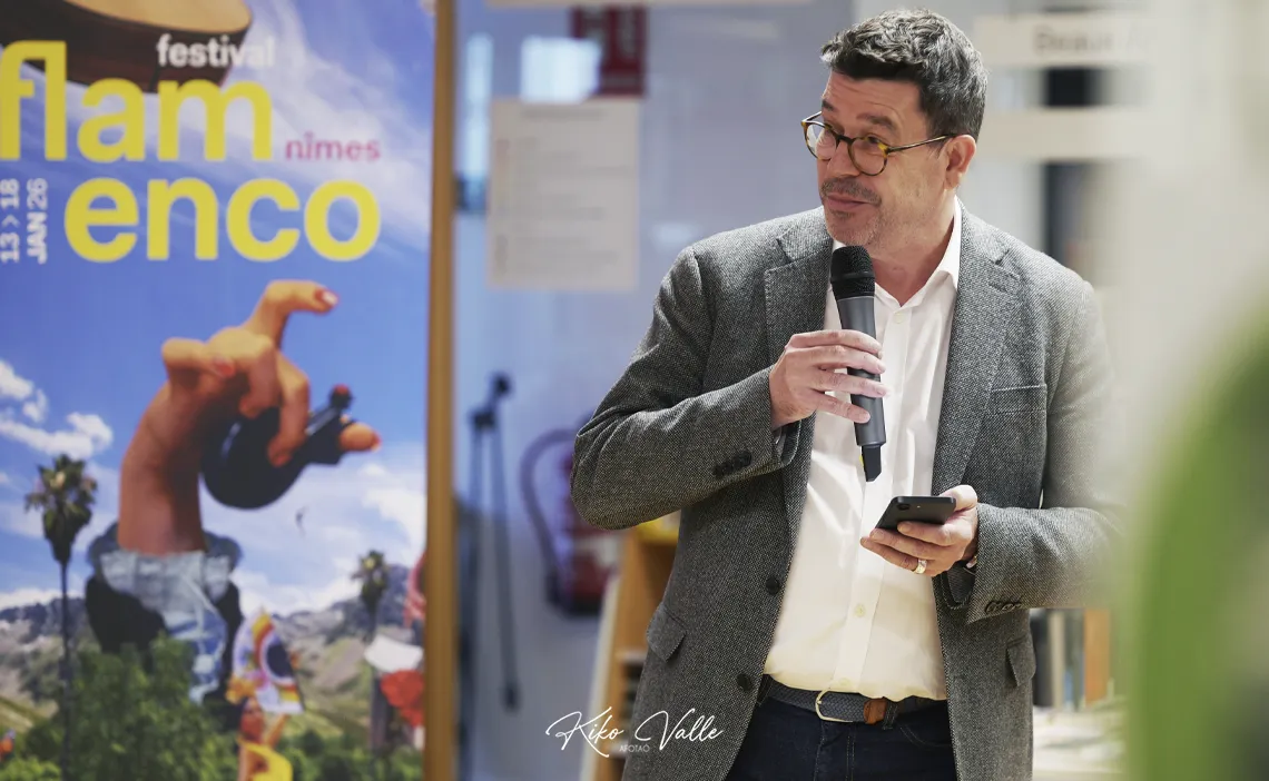 Fue Paul Lalloz, director delegado del Instituto Francés de Madrid, quien abrió el encuentro «para presentar la trigésimo sexta edición de este emblemático festival en el que se verá la riqueza, la creatividad y la vitalidad del flamenco del 13 al 18 de enero de 2026 en el Teatro de Nimes y varios espacios de esta ciudad del sur de Francia». Mostró su gratitud a los artistas presentes y al público, además de a los colaboradores, y expresó su felicidad por acoger en su casa esta rueda de prensa «participando así en la proyección internacional de la muestra y fortaleciendo aun más los vínculos entre los dos países».