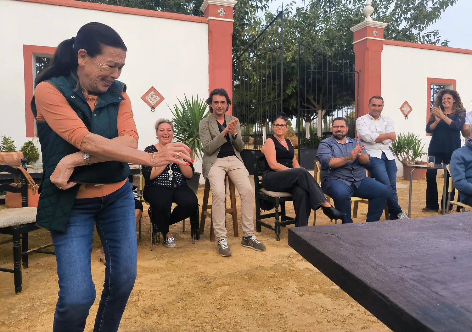 Allí se dio. Hubo motivo. Recibieron un galardón que tenían pendiente de recoger Pepa Montes —que vaya pataíta endiñó— y Ricardo Miño, a quienes dedicaron este año el Concurso Nacional de Cante Jondo Antonio Mairena. Y el ambiente se fue caldeando hasta que la bulería del Nano de Jerez descorchó la gracia y se contagió por el albero. Después el tiempo propició la seguiriya, soleá, bulería por soleá, Levante y otros palos. La guitarra se la rifaban Lito Espinosa y Ricardo Miño. ¡Anda que estaban mancos! Pedro Ricardo no se iba a traer el piano, pero disfrutó como todos. Alicia Gil se entregó flamenquísima rizando los melismas calentitos de su gañote trianero, lo mismo por tangos que por bulerías o soleá de Triana, donde reverdece los ecos adormecidos de la memoria de la cava. Disfrutamos de la gitanería del cante y el baile de Jarrita y su marido, el padre de Antonio Reyes, al que puede que le cueste andar, pero bailar no. Y de la enjundia de Remedios Reyes, más flamenca que un lunar. O de las puñalaítas de la malagueña Paqui Ríos, que dejó sin palabras a los que la desconocían, pegándose tortazos en la cara. También se templaron Susana Romero, Juan Cástulo, Juaneque bordando los cantes malagueños, su hija Lourdes Gálvez del Postigo por abandolaos y hasta el desvergonzao que les escribe, apuntando la soleá y ya entre los últimos jartibles por fandangos. Espero que no se me olvide ninguno. Si es así, perdonadme.