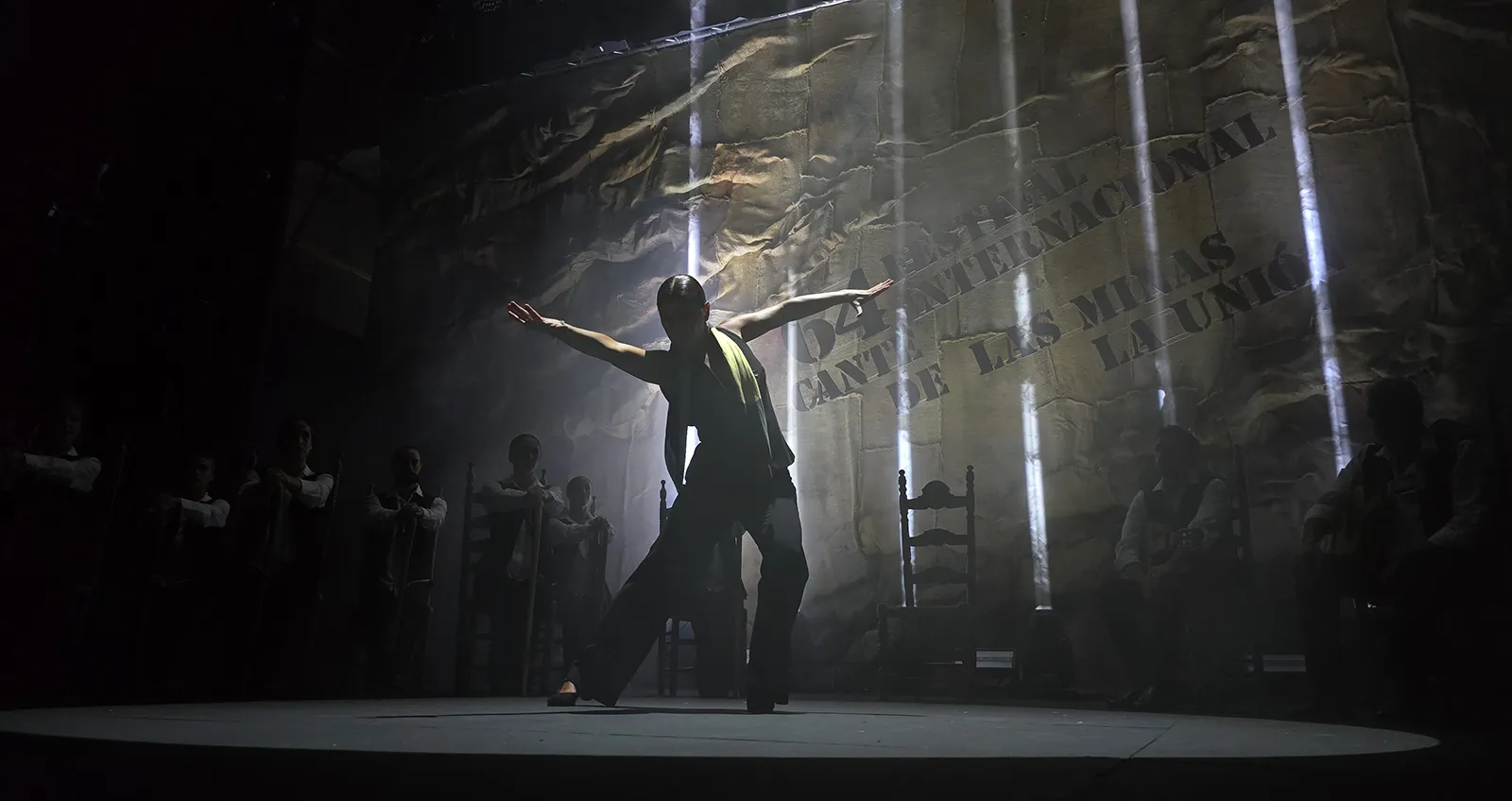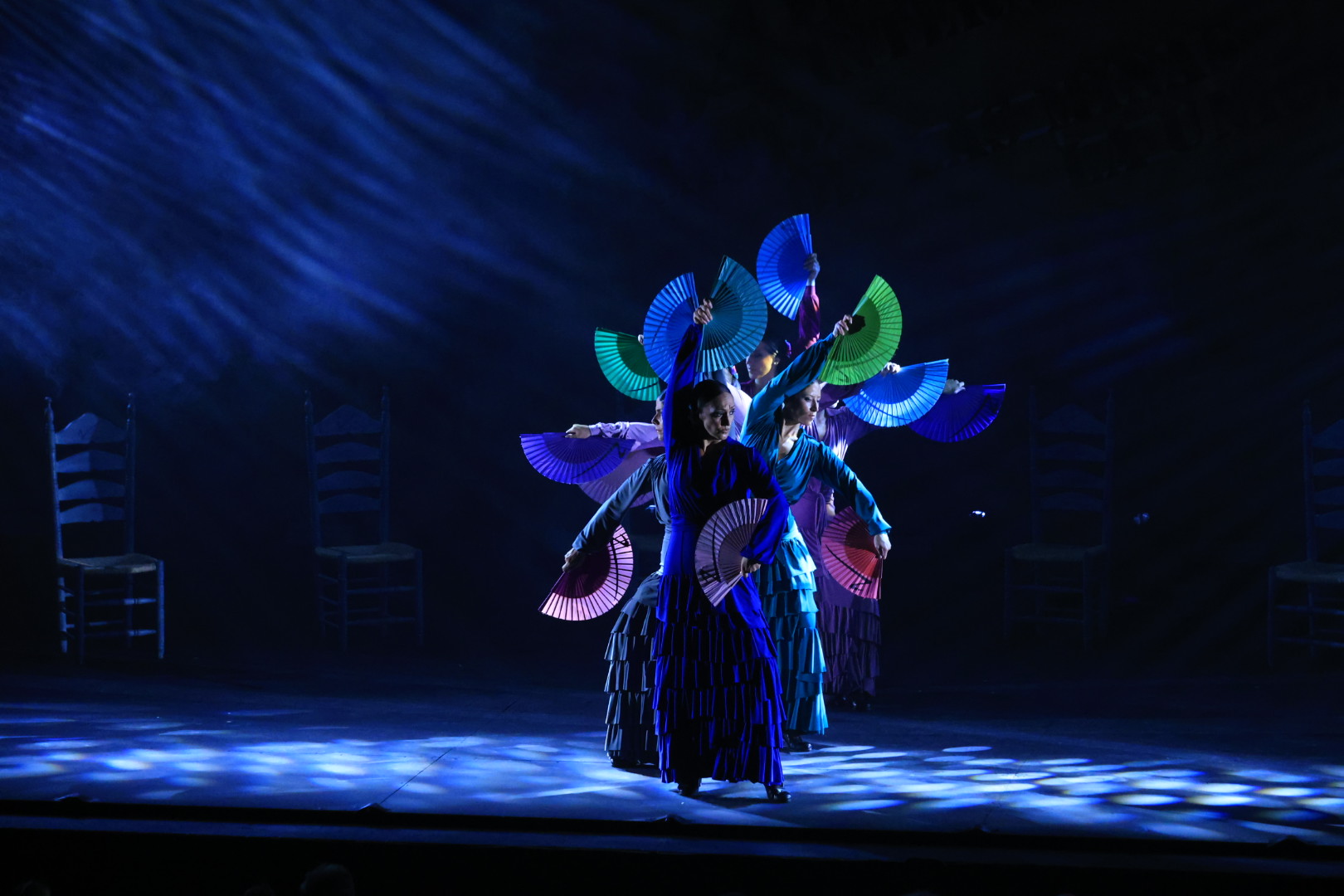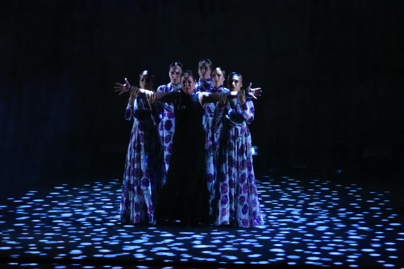 Menos es más es la tónica que acompaña a Vuela. Este proyecto actualiza el estilo de Sara Baras en muchos sentidos. El primero que se percibe es el ámbito visual. Sencillez y minimalismo al servicio de seis cuerdas de luz que representan al maestro, cenitales con formas circulares, el contraluz sin abusos y los fondos lúgubres. Visual y escenográficamente no deja de ser potente, a veces hasta abrumador, sobre todo si le sumas la parte sensitiva. Olor a madera o a incienso inundan el Antiguo Mercado Público convirtiendo esta gala flamenca en una experiencia inmersiva.