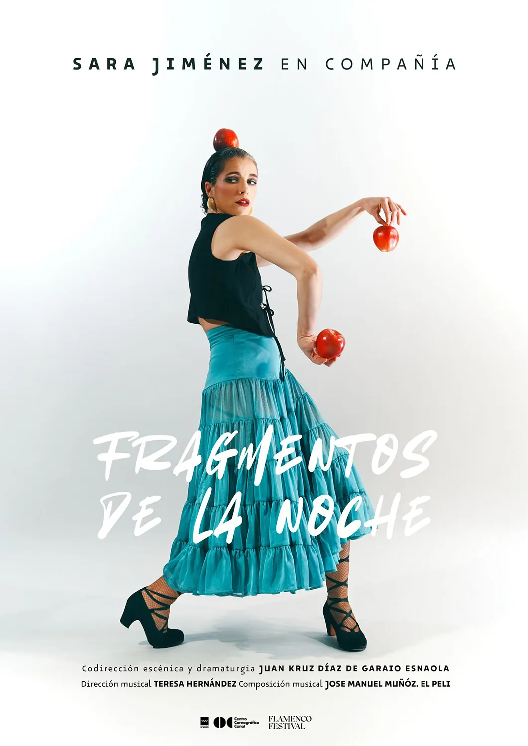 Fragmentos de la noche une los imaginarios de la mitología y lo flamenco para transitar en un viaje imaginario a través de diferentes mitos clásicos “como quien pasea su mirada de una constelación a otra, confundiendo así el paisaje mitológico y el tiempo actual”. De Orfeo a las bodas de Cupido y Psique con las sevillanas míticas de Alosno como banda sonora, de las fiestas populares tatuadas en la memoria colectiva a la historia de Medea releída desde nuestros días, esta obra nace de la convicción de que con la danza y la literatura y lo contemporáneo o lo flamenco como herramientas “es posible explorar el territorio nocturno de la experiencia mítica y arrojar luz sobre ella para saber de qué forma nos interpela hoy”. Y en paralelo, descubrir cómo se relaciona Sara Jiménez con la audiencia, ante la que se presenta como una narradora de historias cuya intención pasa por remover un abanico de emociones para “rasgar el interior del espectador”. En definitiva, y empleando los versos del poeta y novelista cubano José Lezama Lima, este montaje nace para atravesar los fragmentos de la noche “como la liebre penetra en su oscuridad separando dos estrellas apoyadas en el brillo de la yerba húmeda”.