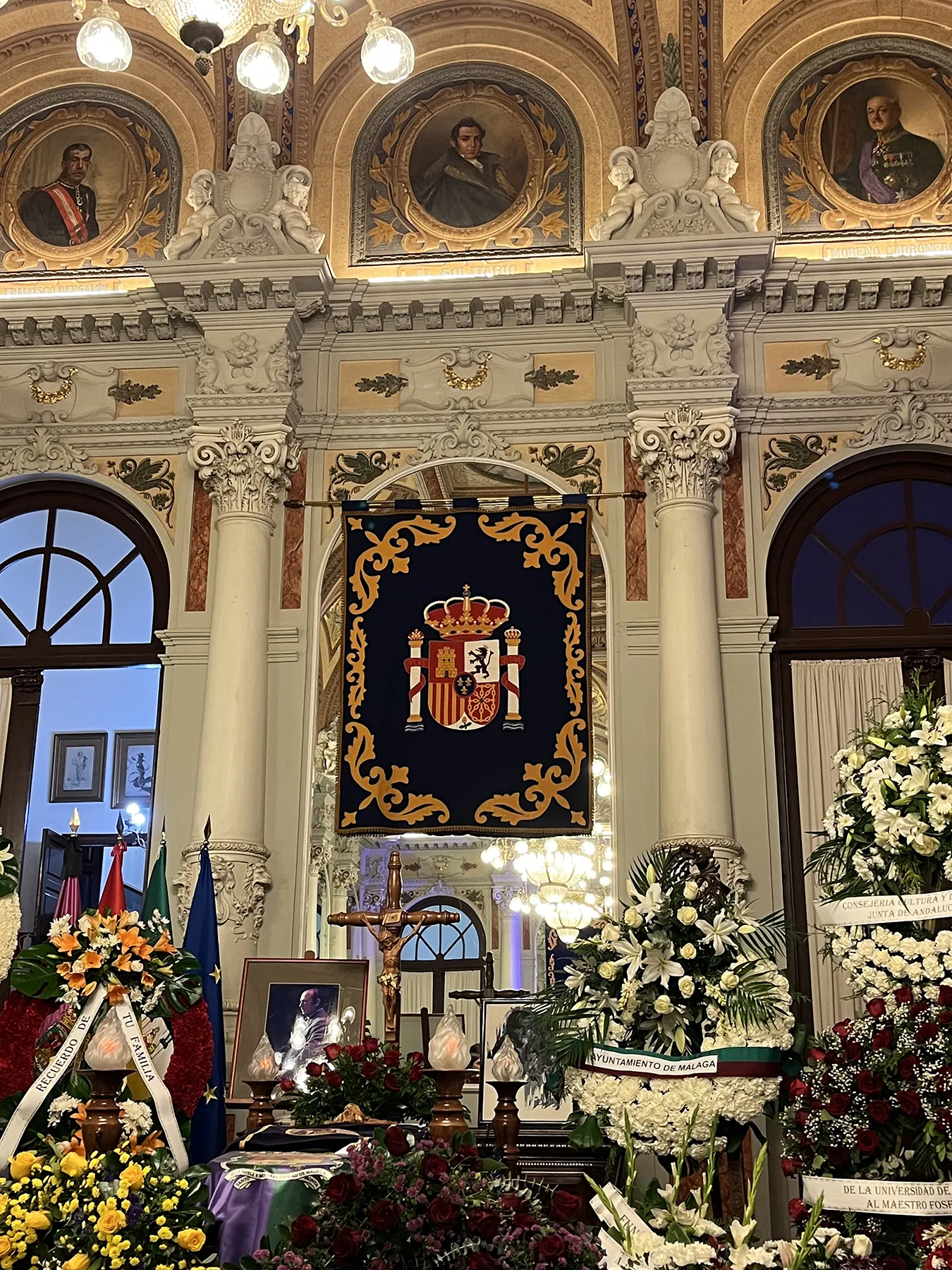 Capilla ardiente de Fosforito en el Salón de los Espejos del Ayuntamiento de Málaga. Arriba, el retrato de Serafín Estébanez Calderón “El Solitario”. Foto: Ramón Soler