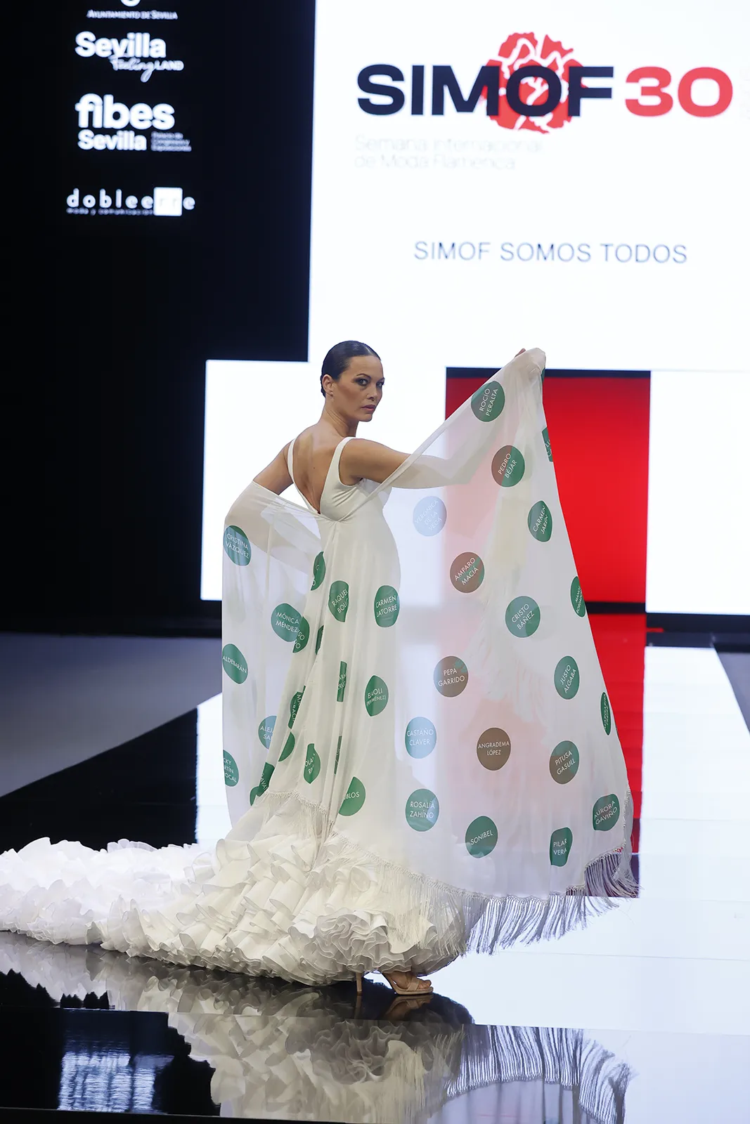 La modelo sevillana Mercedes Muñoz, icónica de SIMOF, ha desfilado con una bata de cola, una pieza única diseñada expresamente para conmemorar el 30º aniversario de SIMOF. Ha sido diseñada por Pedro González, director creativo de SIMOF y estilista, quien ha contado con el respaldo de Flamentex, patrocinador histórico de SIMOF. Concretamente, con sus diseñadores Álvaro del Rey y Javier de Sedas, asesores comerciales de la firma.