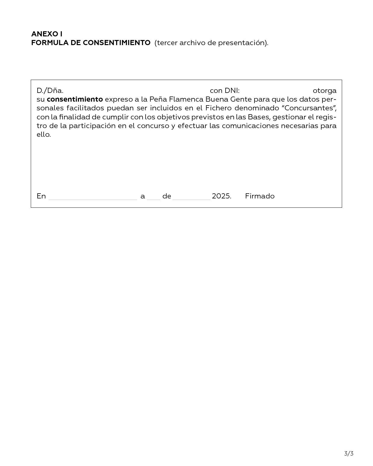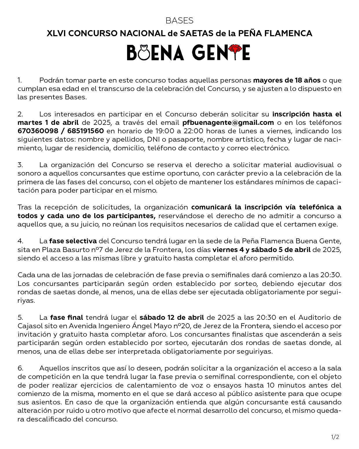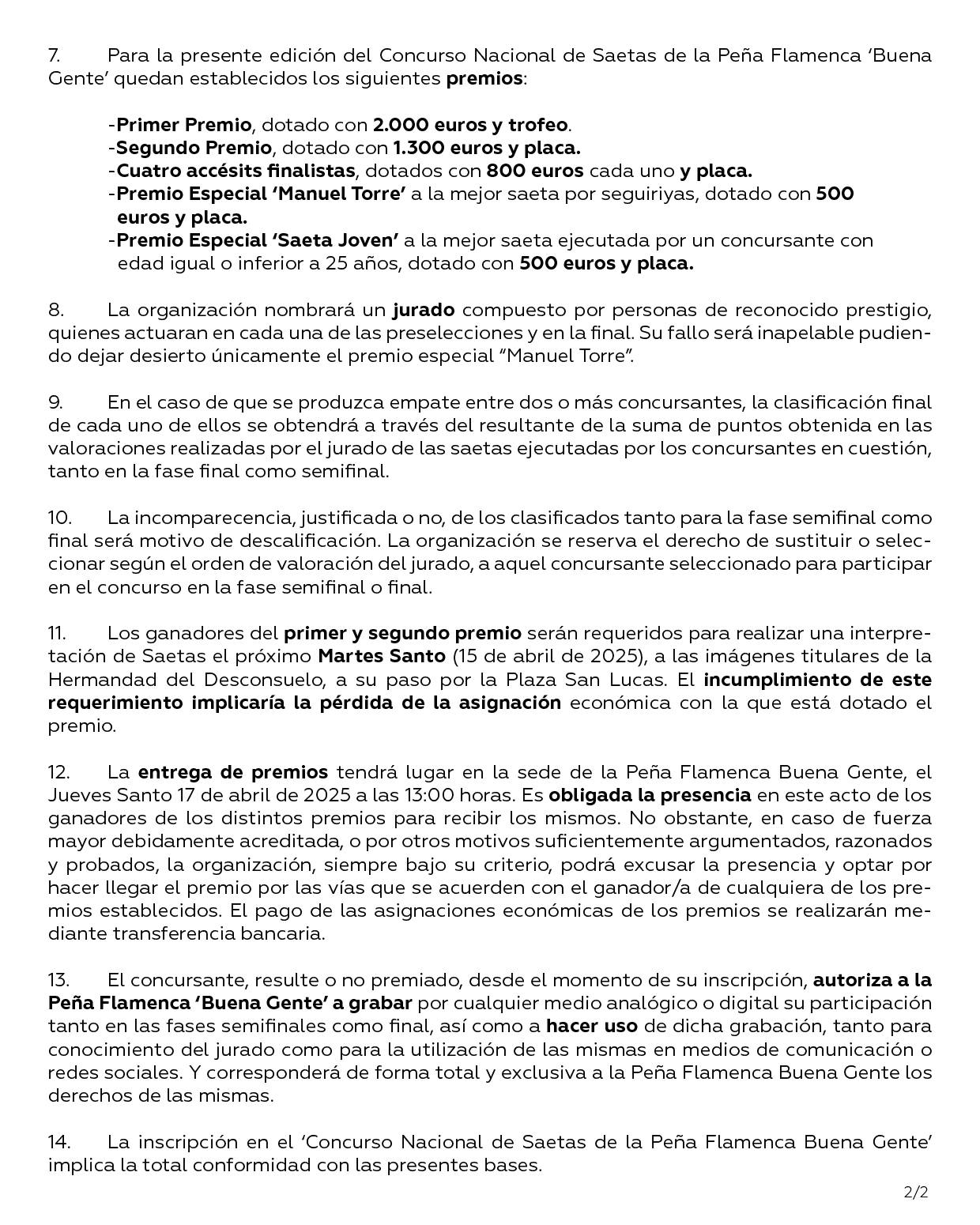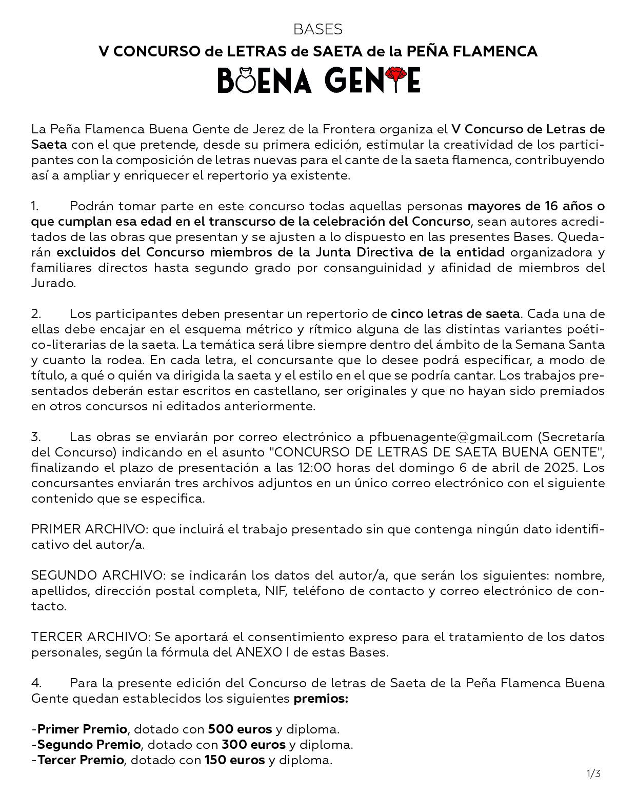 46 edición del Concurso Nacional de Saetas de la Peña Flamenca Buena Gente 2025. Aquí puedes consultar las bases y premios: